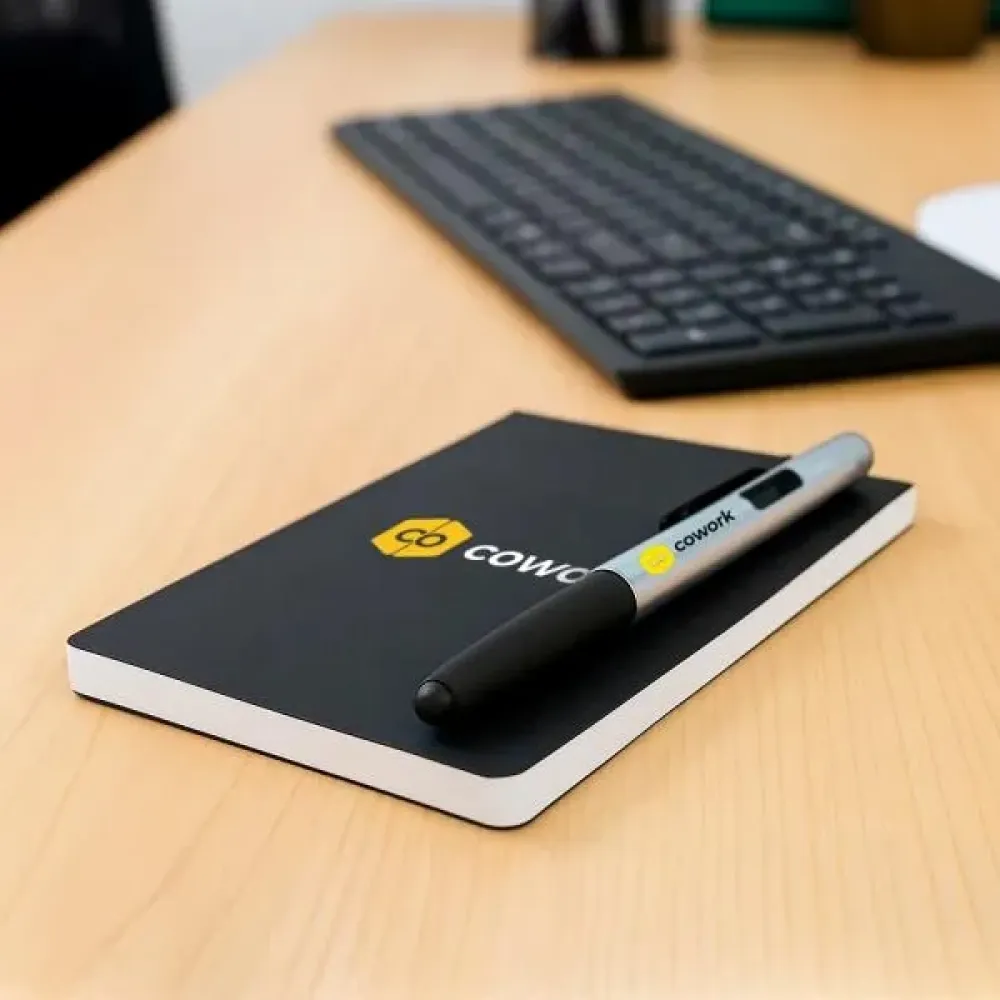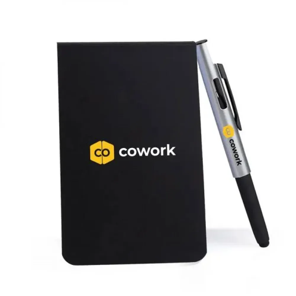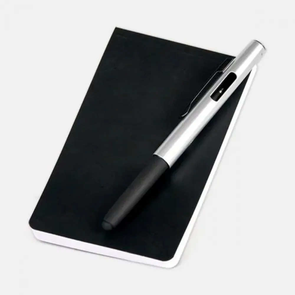 Bloco para anotações com caneta.\nO bloco conta com 100 folhas não pautadas. Caneta esferográfica em ABS prata. Conta com tampa com abertura nas laterais, acabamento fosco, clipe em Metal e ponteira touch em Silicone preto. Carga esferográfica azul.