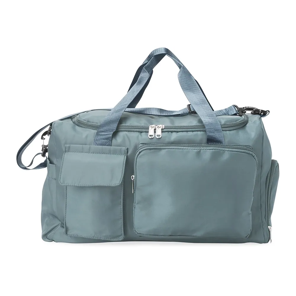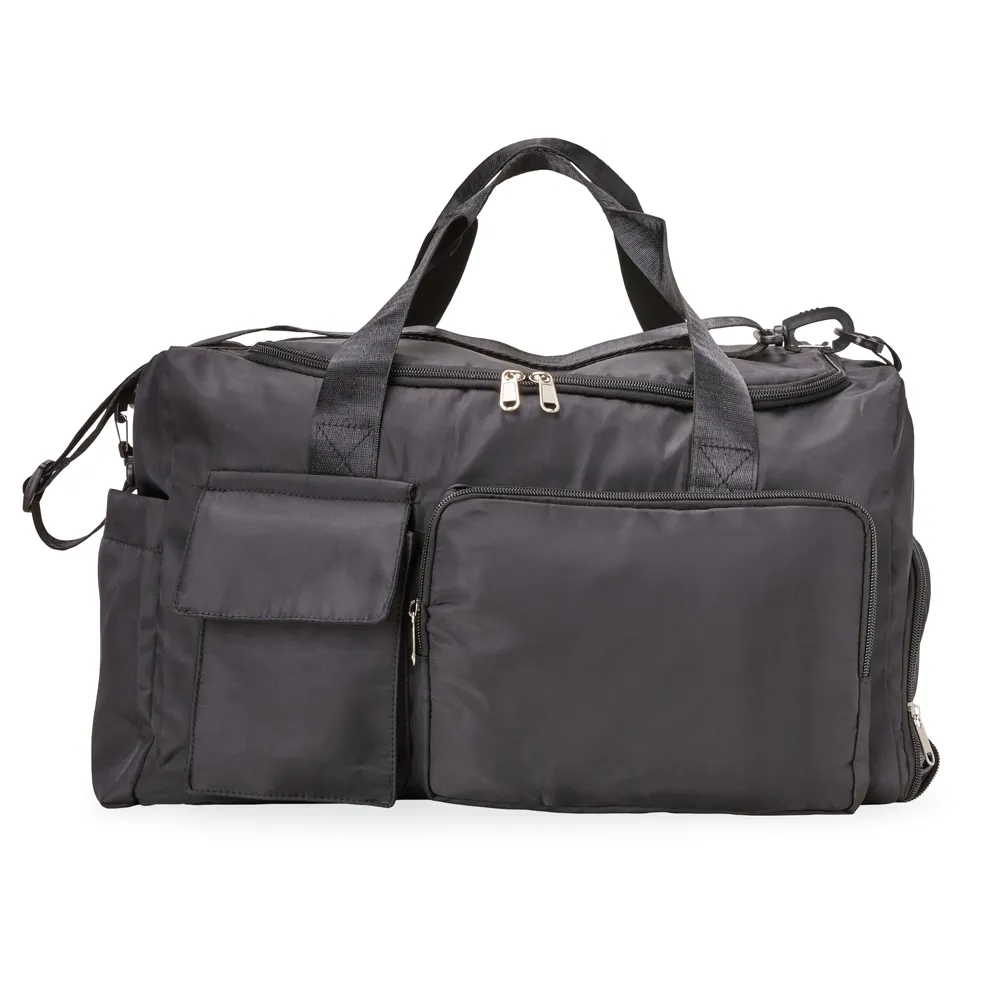 Bolsa de viagem 28 litros em poliéster de impacto impermeável com cinco compartimentos, sendo um deles exclusivos para tênis. Compartimento principal com bolso de zíper exclusivo para itens molhados. Com bolso lateral e duas alças de mãos, a bolsa contém alça transversal removível e bolso para engate em malas de viagem.