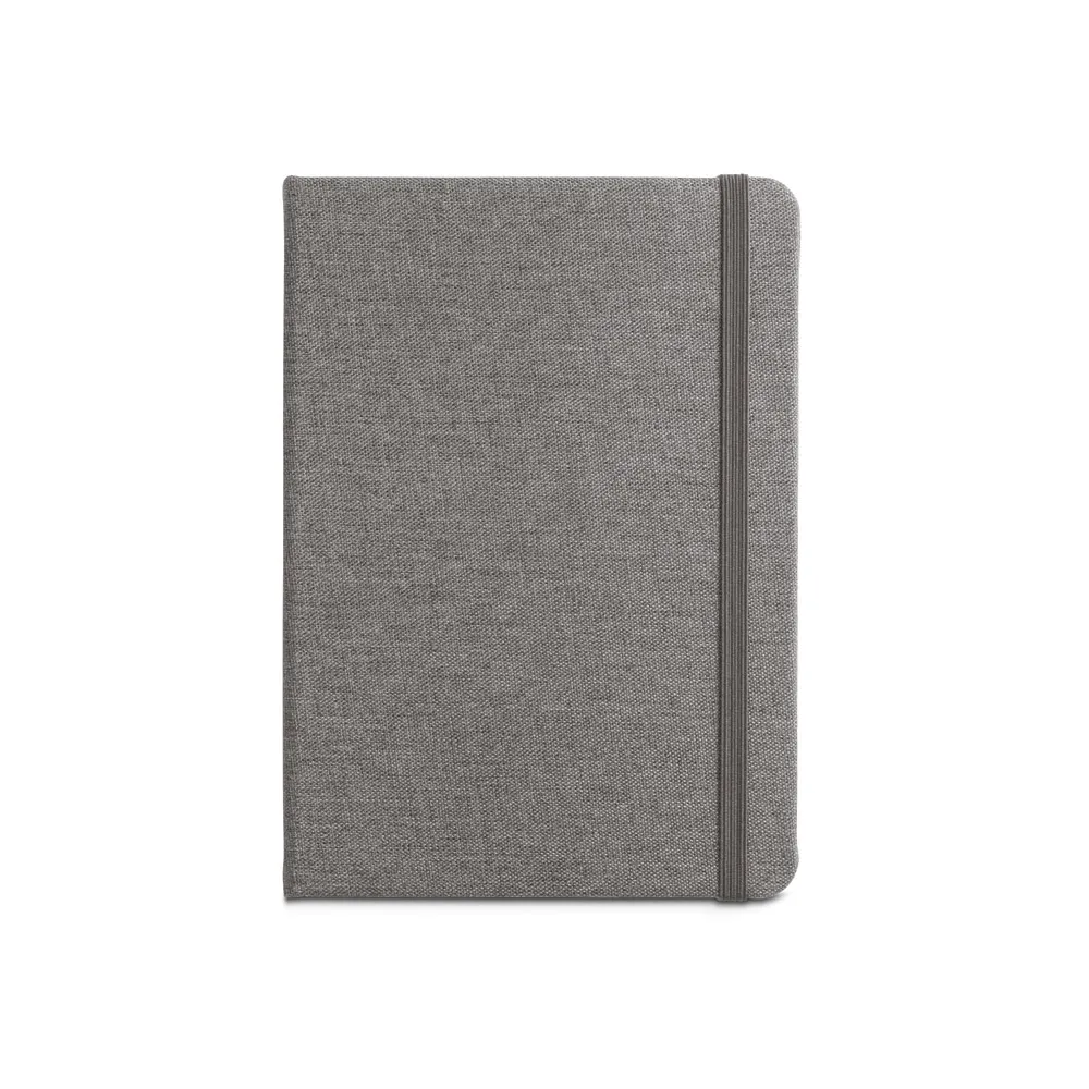 Caderno A5 de capa dura em tecido poliéster 100% reciclado (rPET). Contém 192 páginas pautadas em papel cor marfim, proveniente de gestão florestal sustentável, fita separadora, elástico e bolso em papel na parte traseira da capa. 140 x 210 mm
