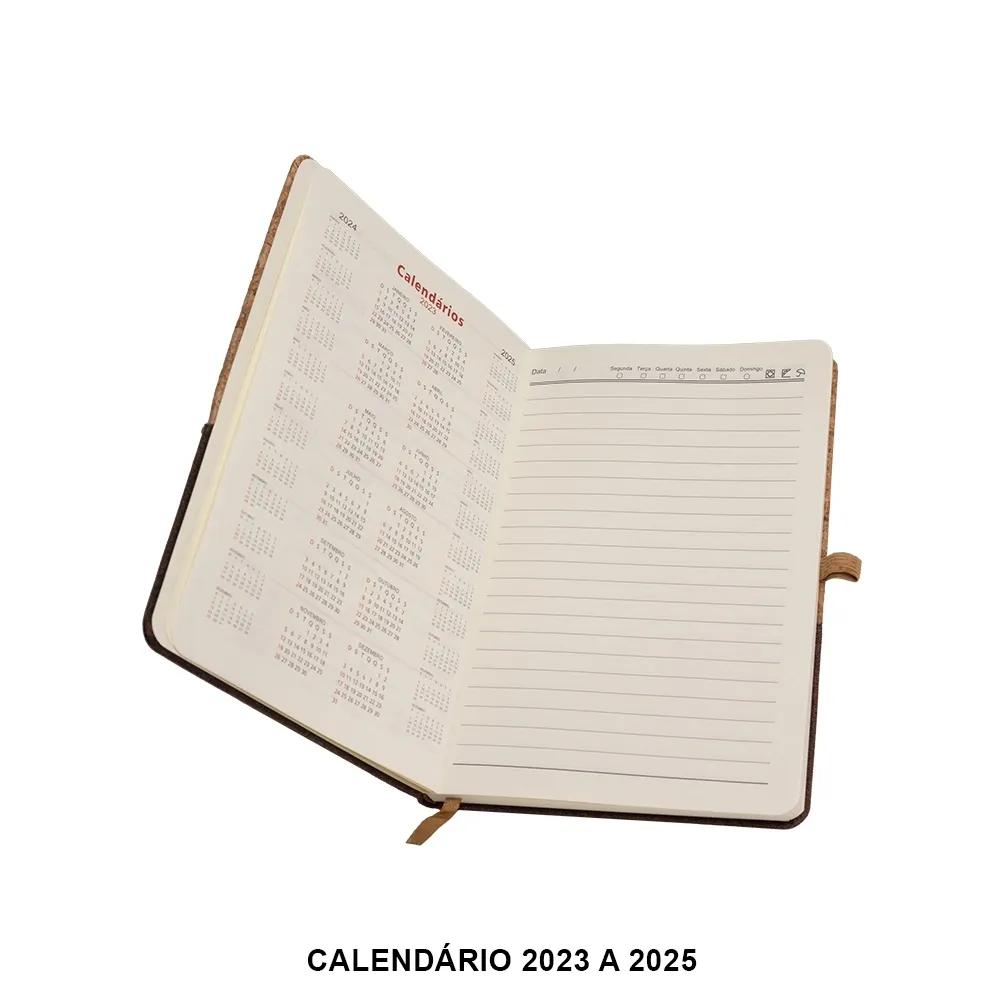 Caderneta A5 de cortiça com detalhe em linho e suporte para caneta, contém marcador de página em cetim, página para dados pessoais, calendário e aproximadamente 93 folhas marfim com pauta.\r\nObs.: Calendário 2023 à 2025.