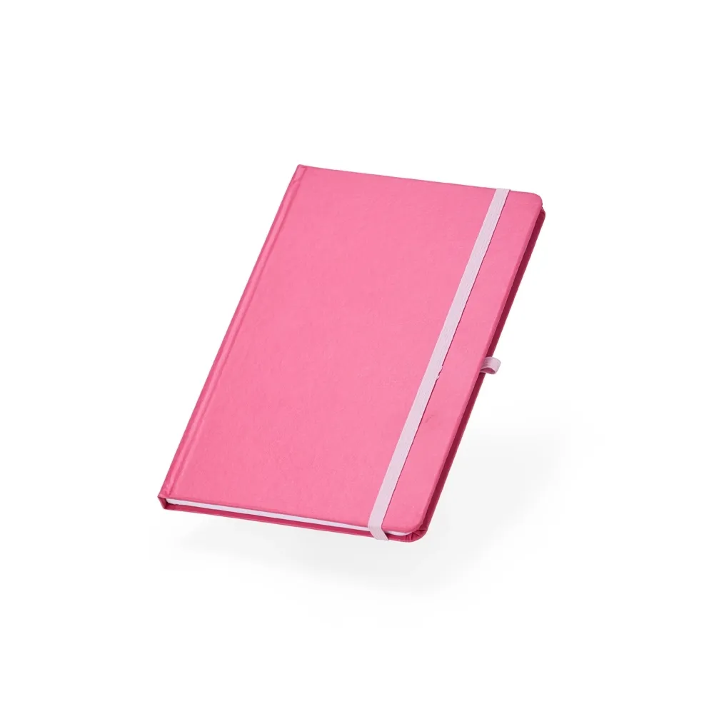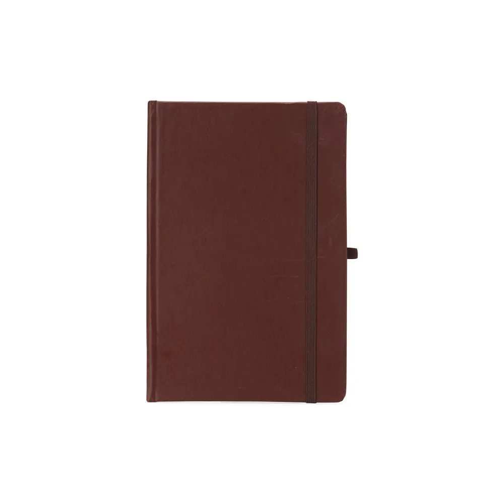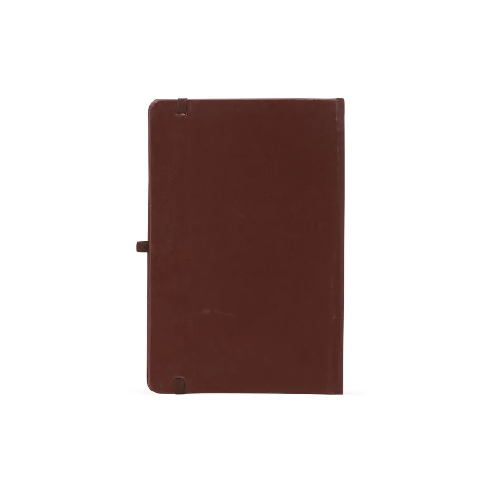 Caderneta de couro sintético com suporte para caneta, elástico para lacre e marcador de página em cetim, contém aproximadamente 80 folhas com pauta na cor branca.