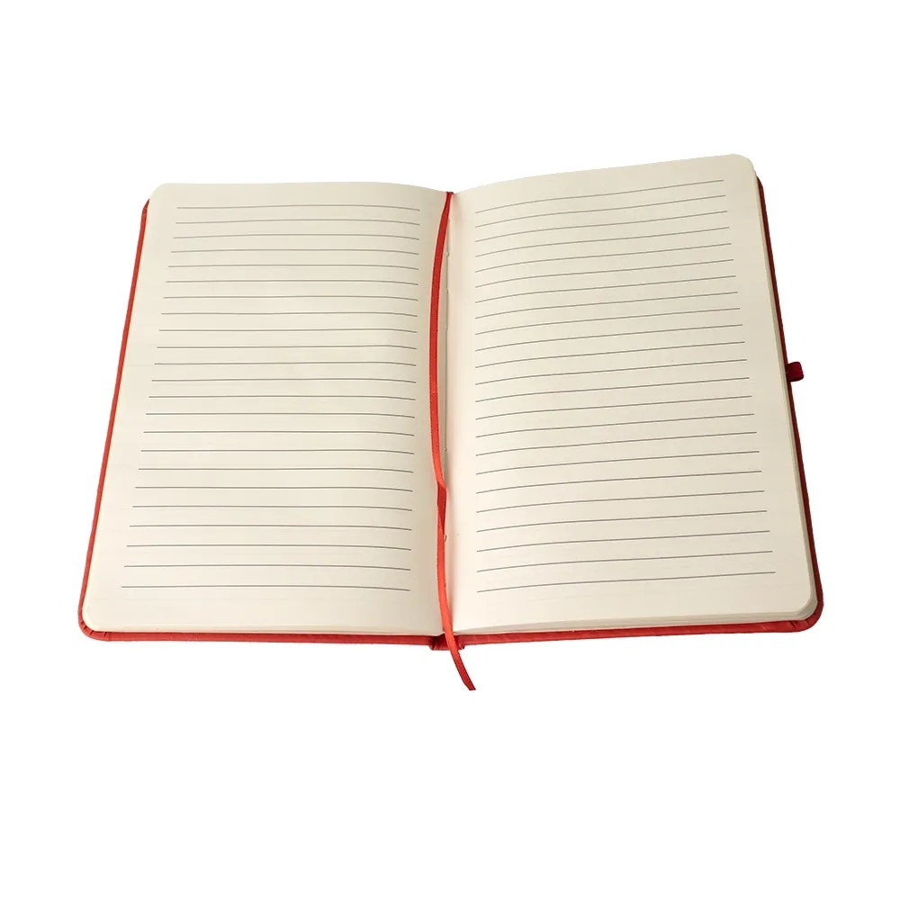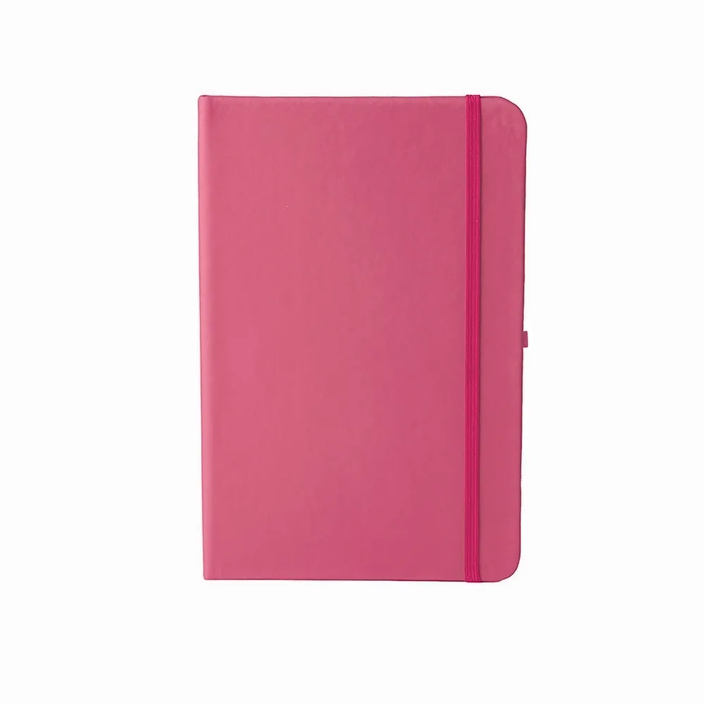 Caderneta em couro sintético com porta caneta, marcador de página em cetim e fita elástica para lacre. Contém aproximadamente 80 folhas pardas com pauta.