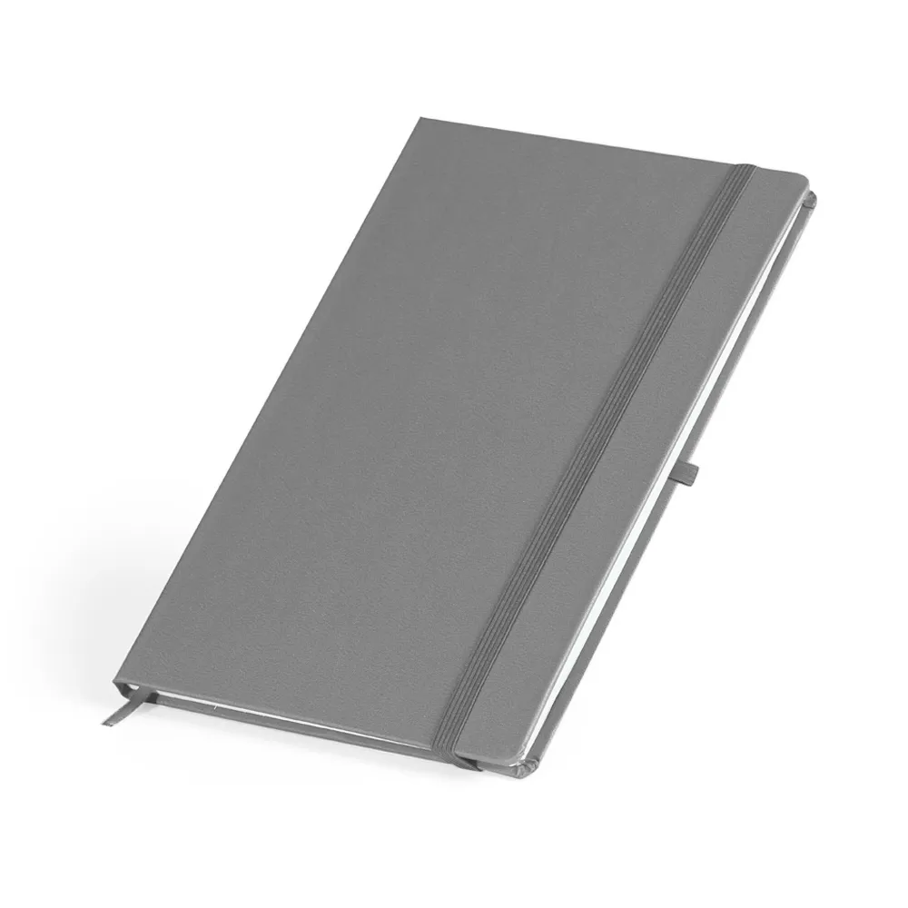 Caderneta em percalux com porta caneta, marcador de página em cetim e fita elástica para fechar. Contém aproximadamente 80 folhas com pauta.