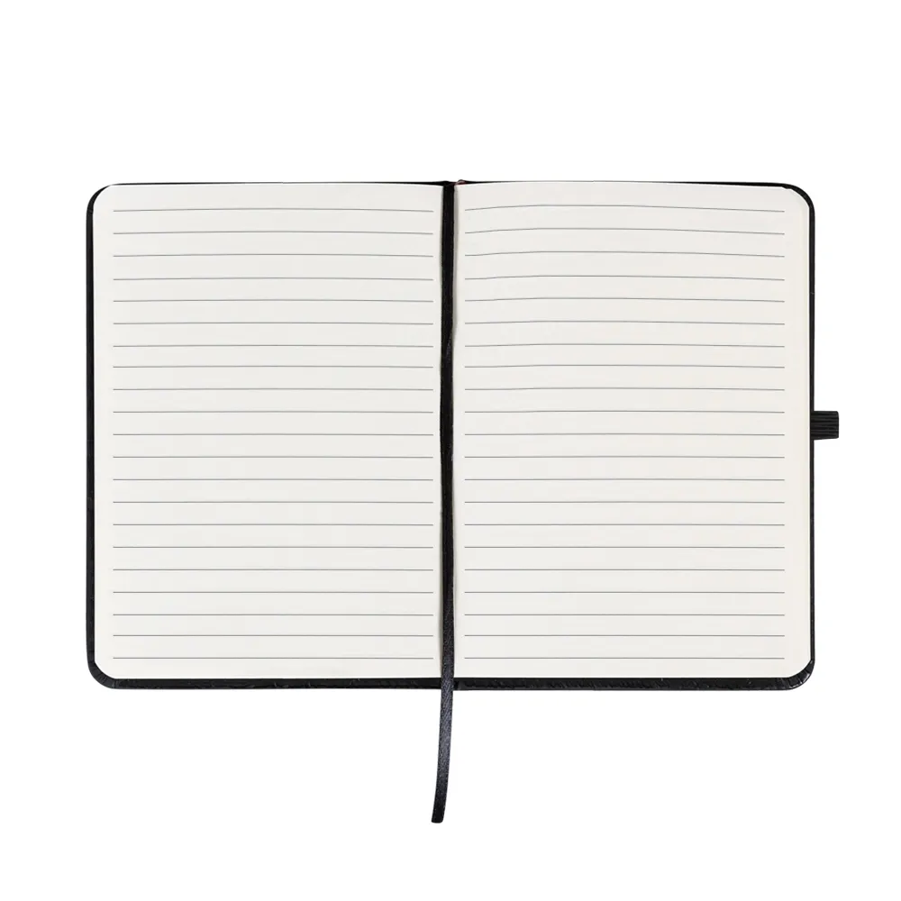 Caderneta emborrachada com elástico para lacre, marcador de página em cetim e porta caneta, contém aproximadamente 84 folhas marfim com pauta.