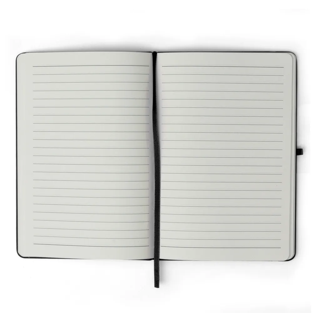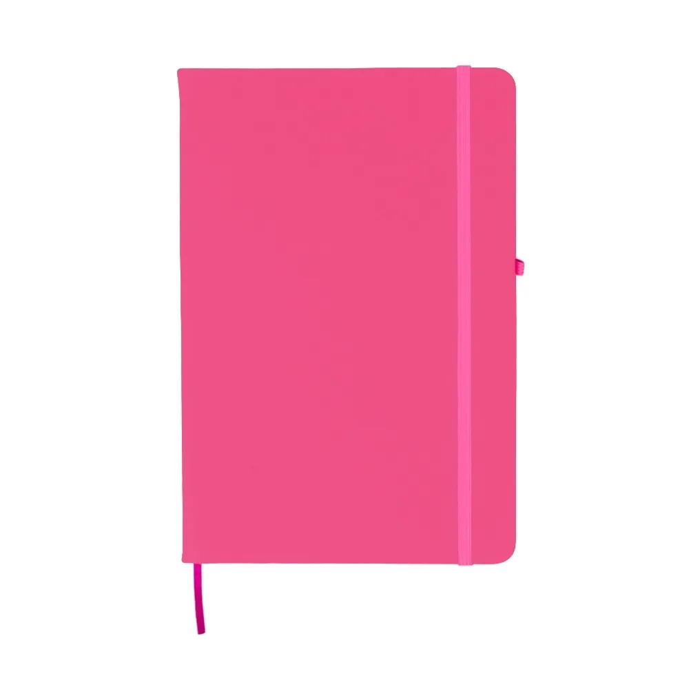 Caderneta emborrachada com porta caneta elástico em nylon, marcador de página em cetim e fita elástica de nylon para fechar. Contém aproximadamente 80 folhas pardas pautadas.