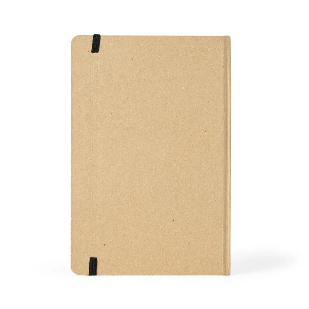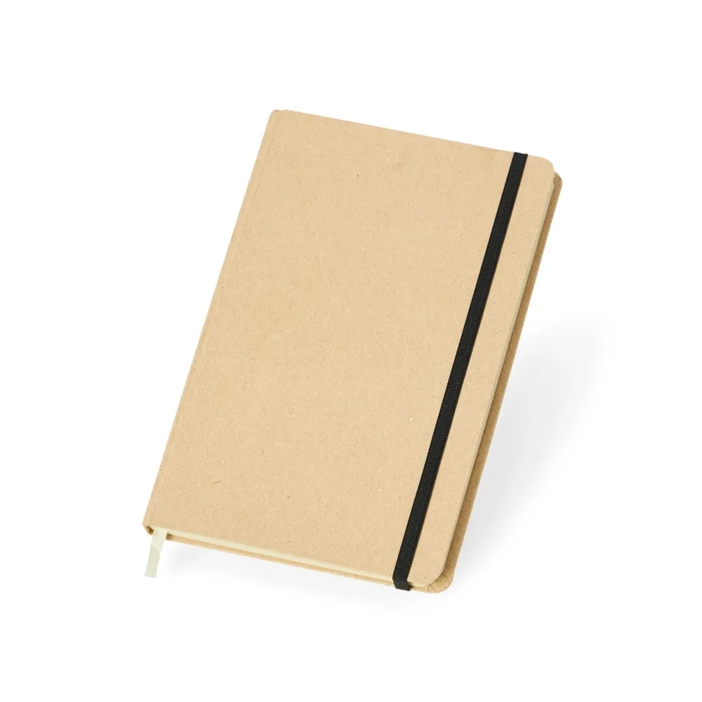 Caderneta de kraft com marca página em cetim e elástico para lacre. Contém aproximadamente 80 folhas marfim sem pauta.