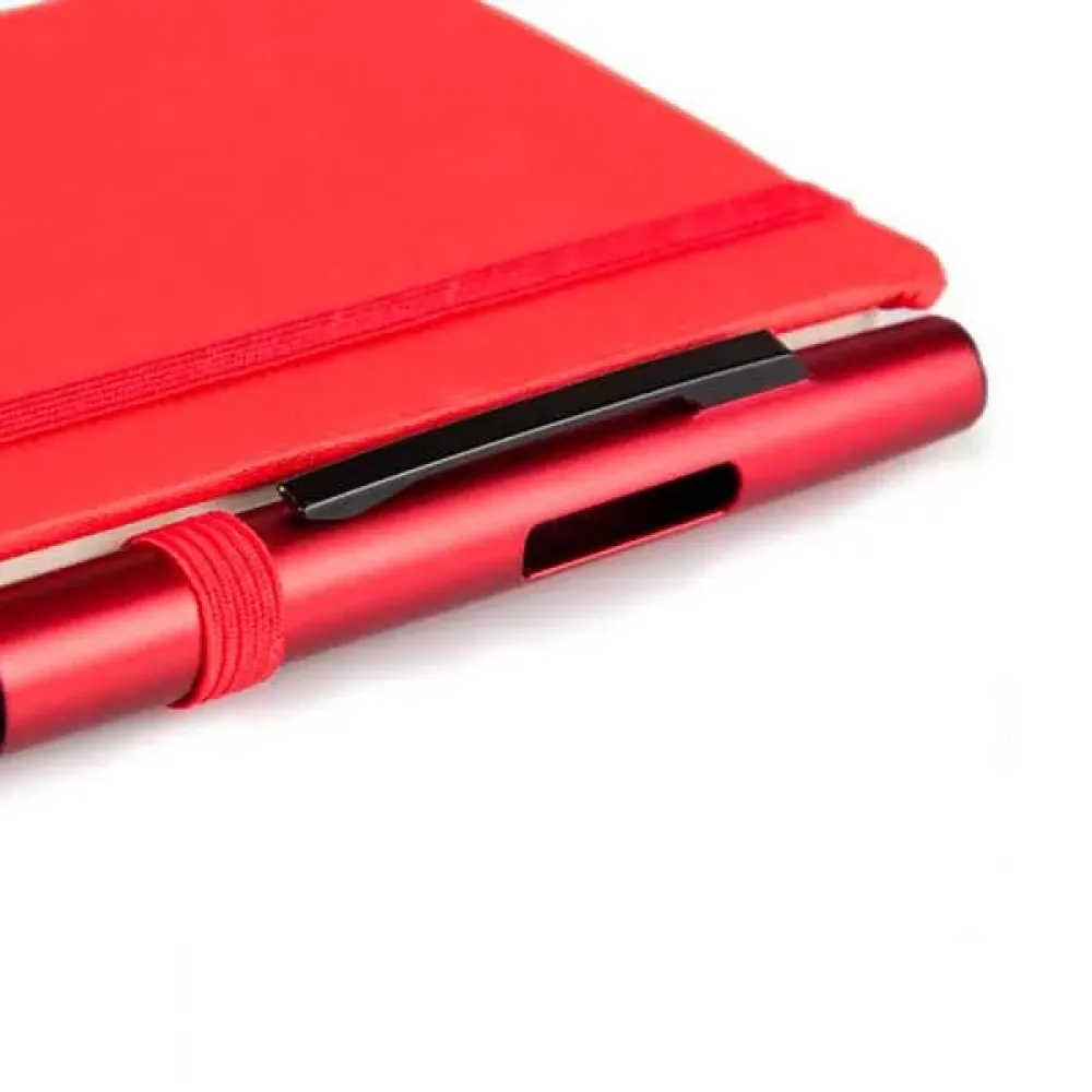 Caderno para anotações vermelho com capa dura.\nConta com 80 folhas não pautadas, marcador de página, porta caneta e elástico para fechamento. Gramatura da folha de 70 g/m2.