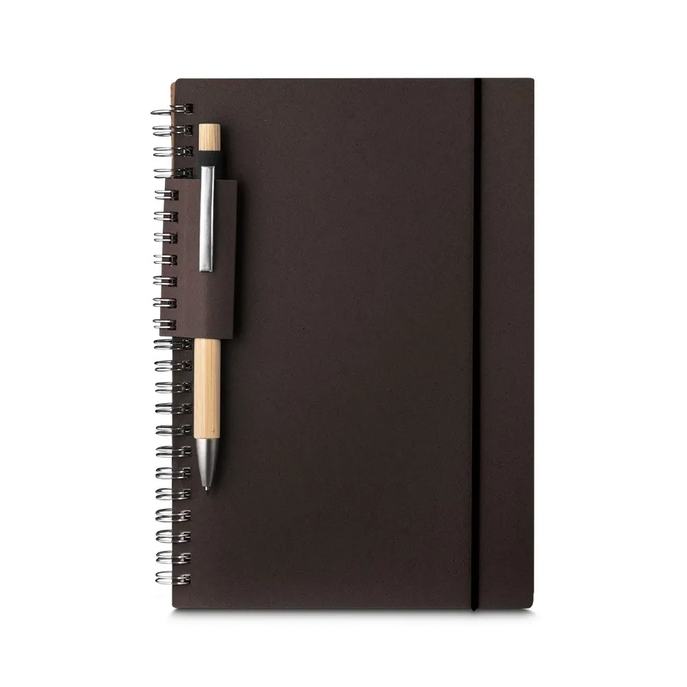 Caderno A5 com capa em papel 100% reciclado. Possui elástico para lacre, contém aproximadamente 70 folhas pautadas na cor bege e suporte para caneta de papel. Obs.: Não acompanha caneta.