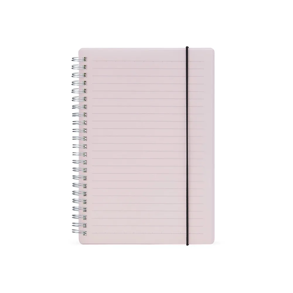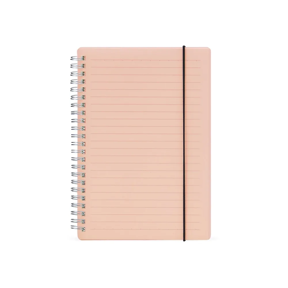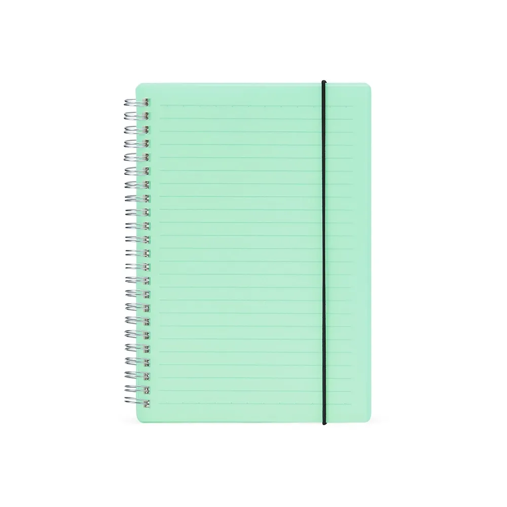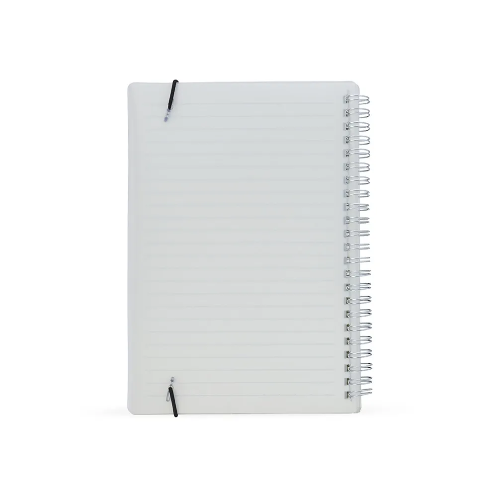 Caderno A5 com capa plástica e elástico para lacre, contém aproximadamente 80 folhas marfim com pauta.
