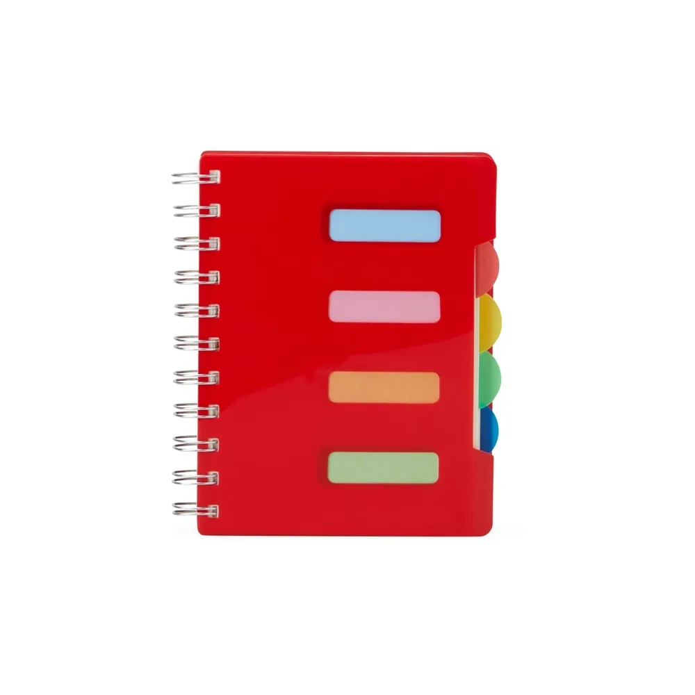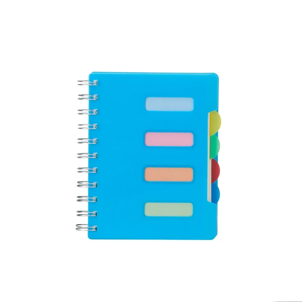 Caderno pequeno com 4 divisórias e abas para identificações, capa plástica com wire-o metálico. Contém aproximadamente 103 folhas marfins e folha inicial com tarjas para organizar e identificar as divisórias.