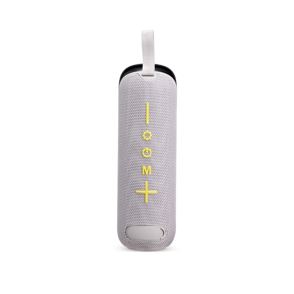 Caixa de som multimídia com estrutura em plástico, acabamento frontal em malha e alça em nylon para transporte. Possui conexão Bluetooth 5.3, rádio FM e compatibilidade com a tecnologia TWS, que permite sincronizar duas caixas de som simultaneamente. Conta ainda com painel de botões e entradas USB-A, TF, auxiliar (P2) e USB-C, possibilitando a reprodução de arquivos MP3 a partir de pen drives e cartões microSD. Acompanha cabo USB-C e cabo auxiliar P2.
