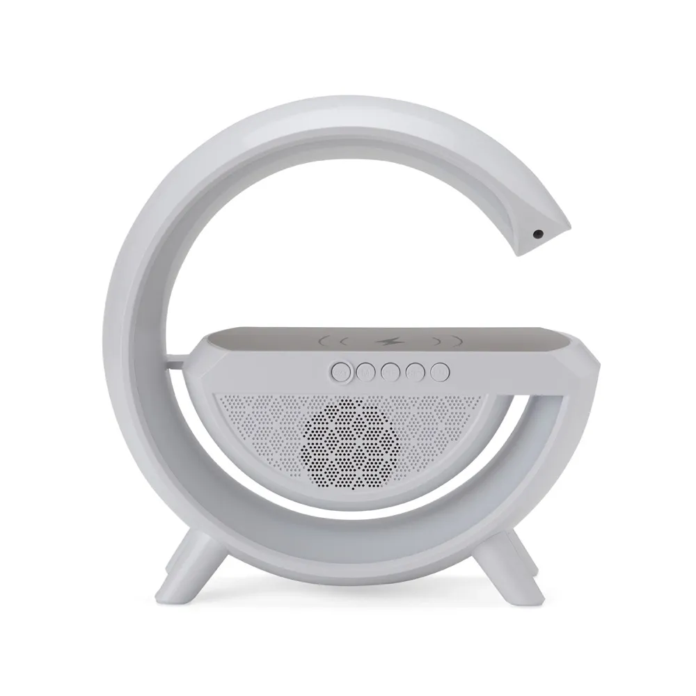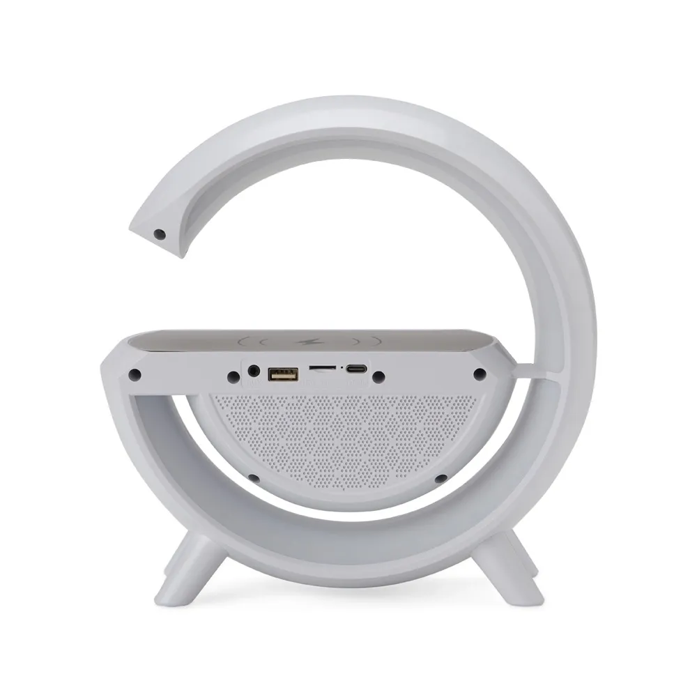 Caixa de som multimídia com estrutura em plástico, iluminação em LED ajustável e espaço para carregamento de dispositivos por indução. Possui conectividade Bluetooth 5.2 e rádio FM, além de entradas auxiliar P2, USB-C, USB-A e TF, possibilitando a reprodução de arquivos MP3 a partir de pen drives e cartões microSD. Acompanha cabo USB-C para recarga da caixa.\r\n\r\nObservação: o produto possui bateria interna para funcionamento próprio. A função de carregamento por indução (tecnologia Qi) opera apenas quando a caixa de som estiver conectada a uma fonte de energia.