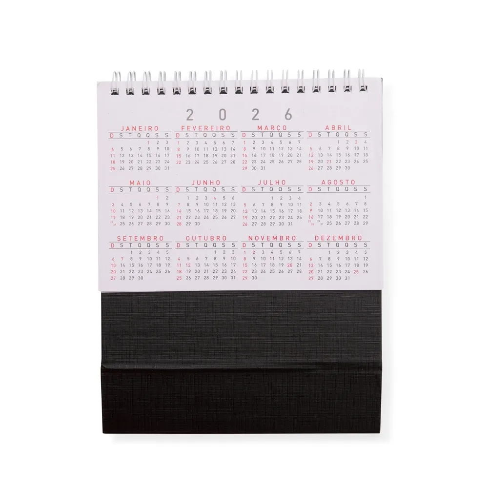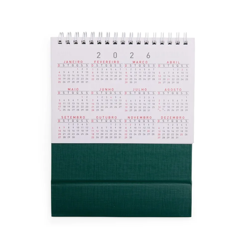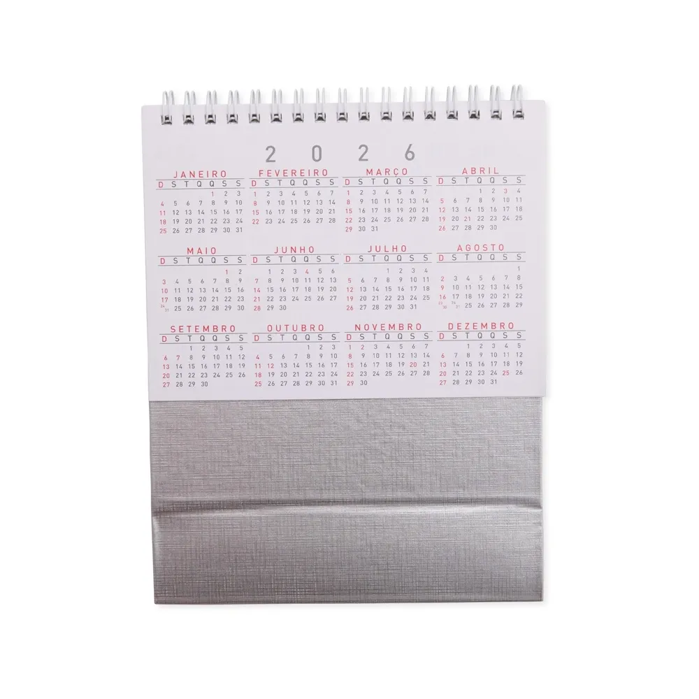 Calendário de mesa 2026 em papel couche 115g, base percalux.