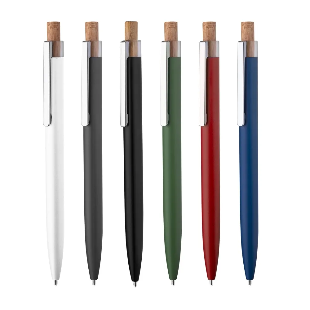 Caneta em alumínio reciclado com carga esferográfica azul 1.0mm e acionamento de clique em bambu.
