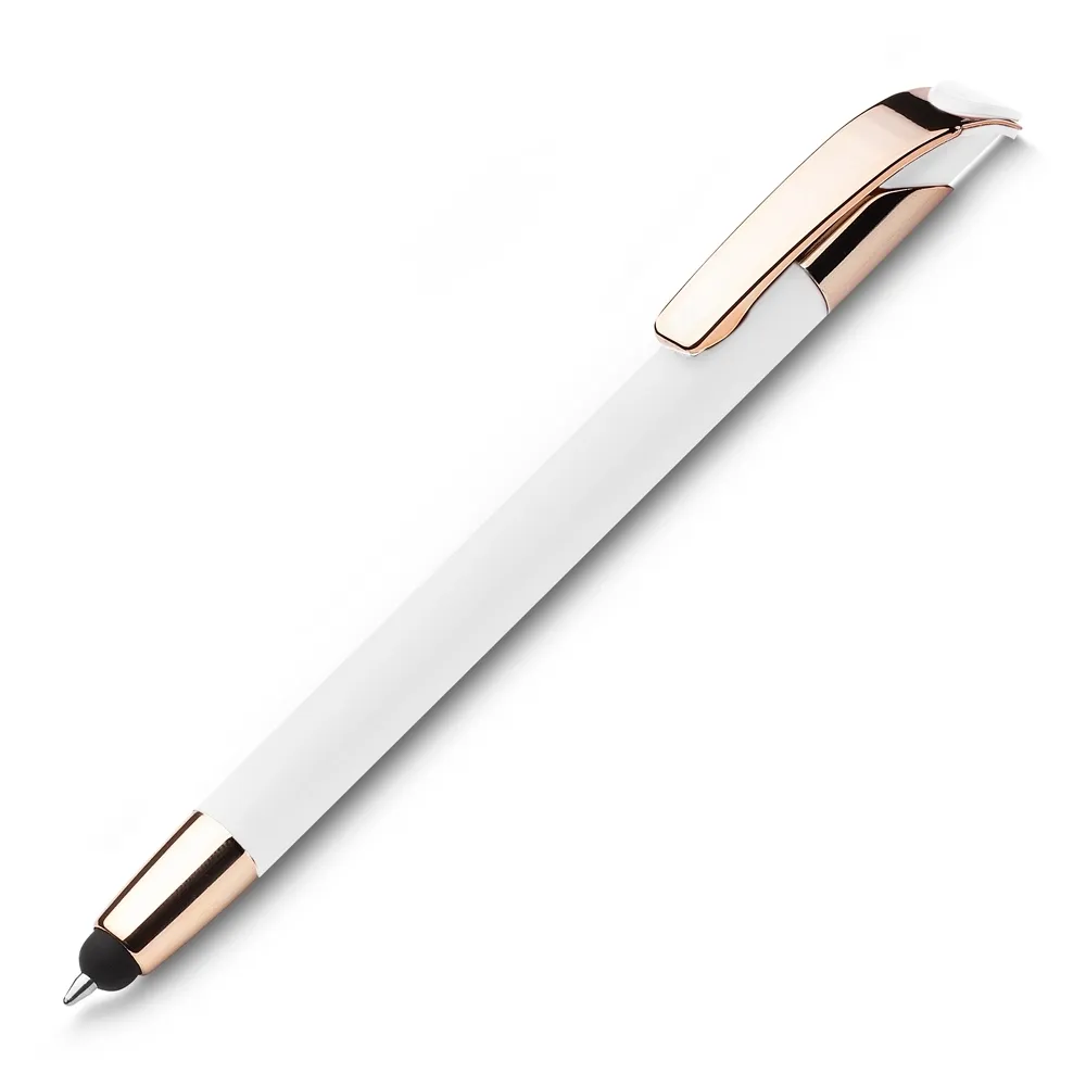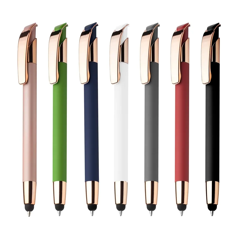 Caneta touch screen em alumínio reciclado com acabamento similar à borracha. Acionamento por clique e carga esferográfica azul 1.0mm.\r\n
