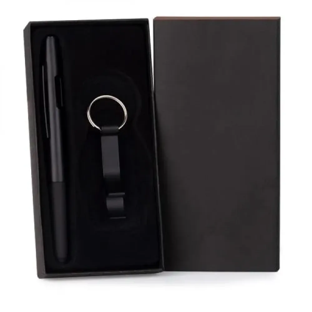 Conjunto de caneta e chaveiro em metal.\nCaneta esferográfica em ABS preta. Conta com tampa com abertura nas laterais, acabamento fosco, clipe em metal, ponteira touch em silicone preto e carga esferográfica azul. \nChaveiro confeccionado em alumínio, possui as funções de abridor de garrafa e latinha.