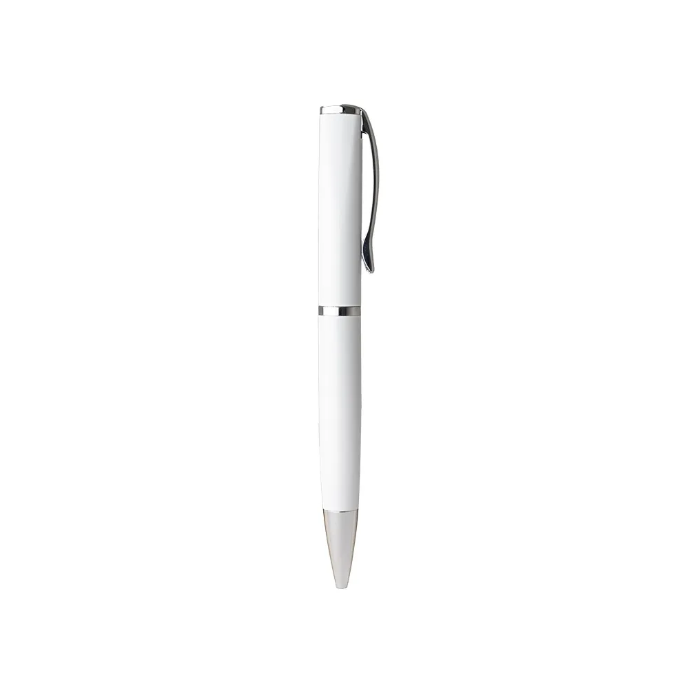 Caneta metálica com carga esferográfica azul 1.0mm e acionamento por rotação.