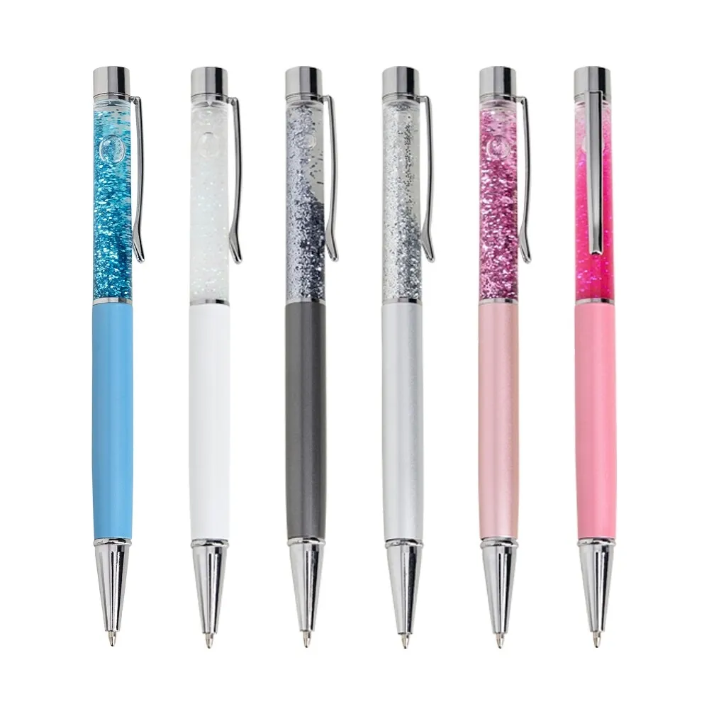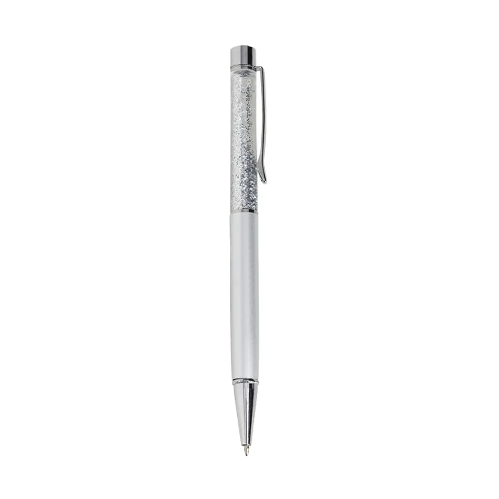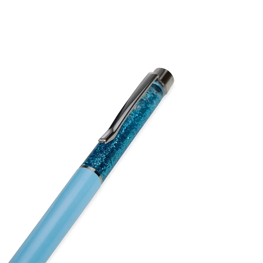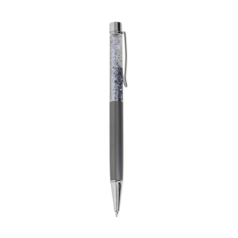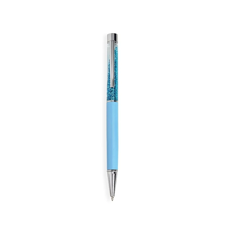Caneta metálica com glitter, acionamento por rotação e carga esferográfica 1.0mm azul.\r\n