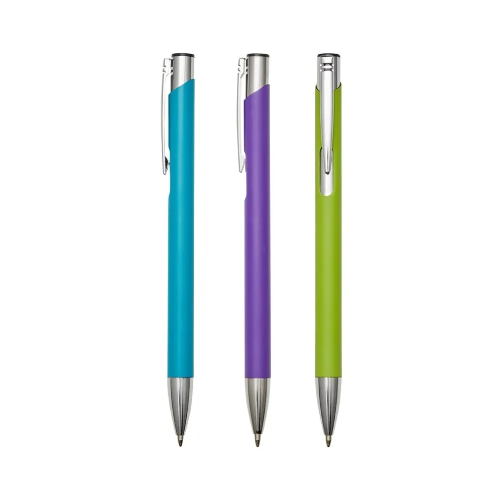 Caneta metálica com carga esferográfica azul 1.00mm e acionamento por clique.