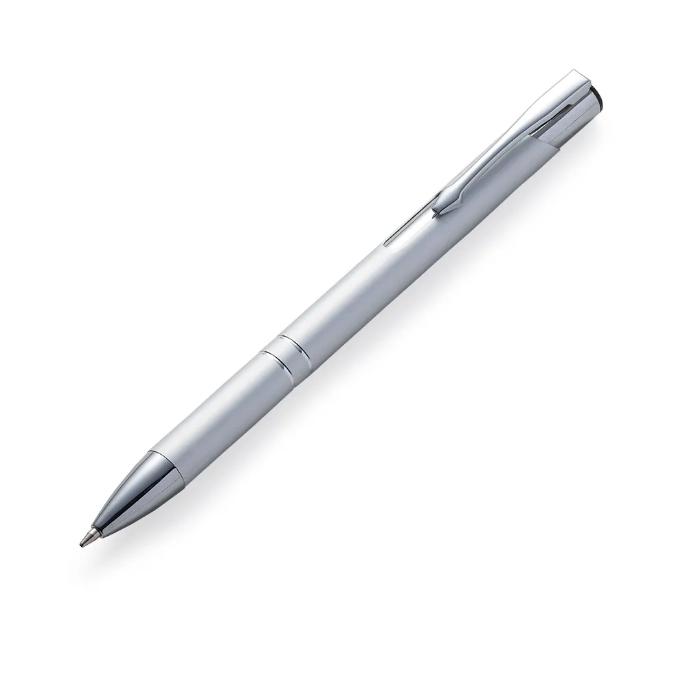 Caneta metálica com carga esferográfica azul e acionamento por clique.