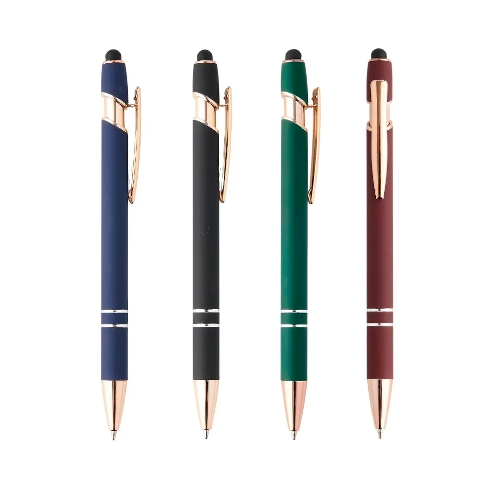 Caneta metálica touchscreen com acabamento similar à borracha, acionamento por clique e carga esferográfica azul 1.0mm.\r\n
