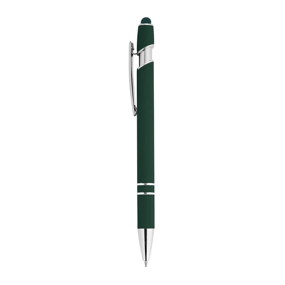 Caneta metálica touchscreen com acabamento similar à borracha, acionamento por clique e carga esferográfica azul 1.0mm.
