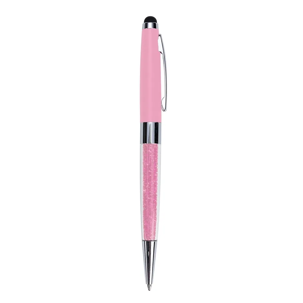 Caneta metálica com touch screen e detalhes em cristal, carga esferográfica azul e acionamento por rotação.