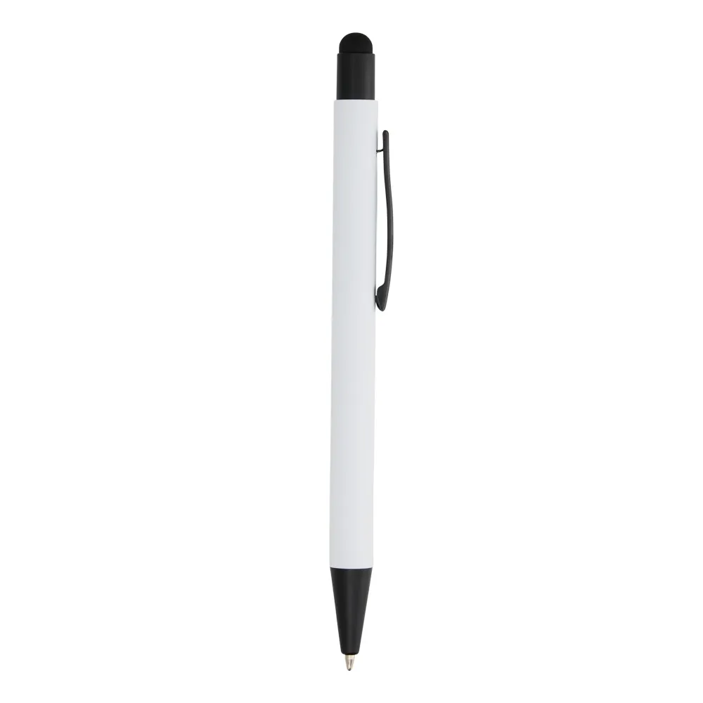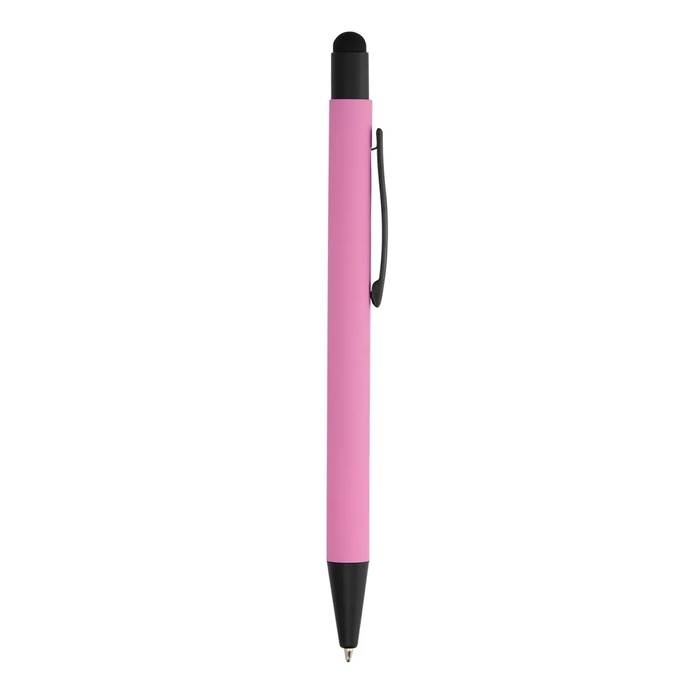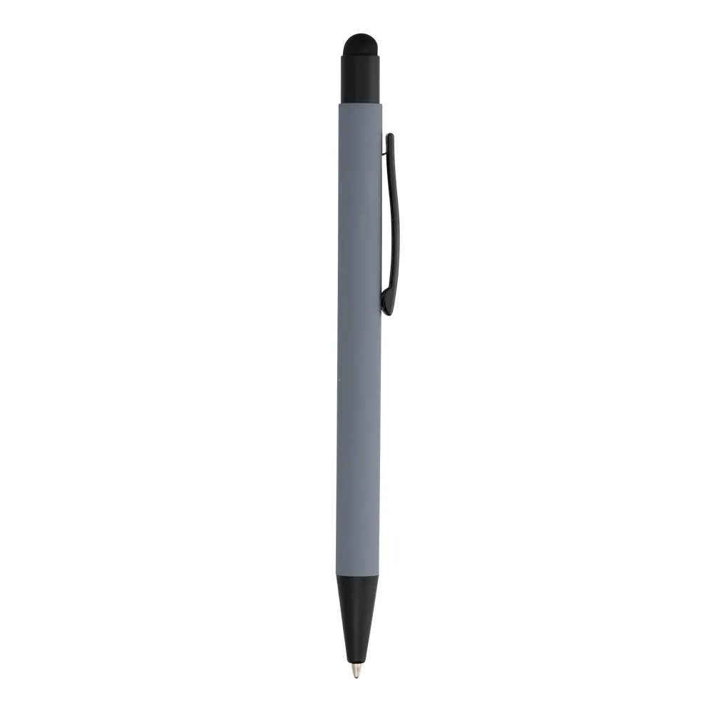 Caneta metálica touchscreen com acabamento emborrachado, acionamento por clique e carga esferográfica azul 1.0mm.