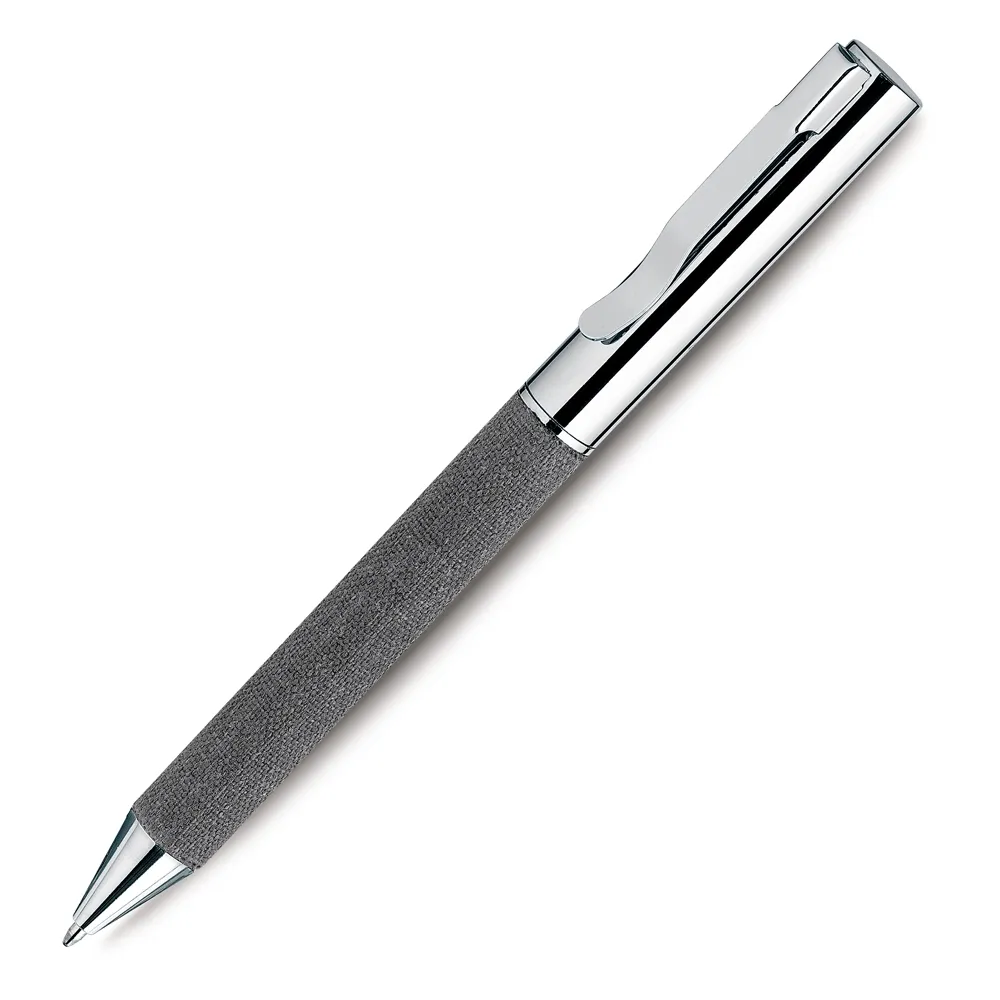 Caneta esferográfica de metal com escrita em azul.\r\n\r\nAcompanha estojo em material reciclável na cor da caneta.