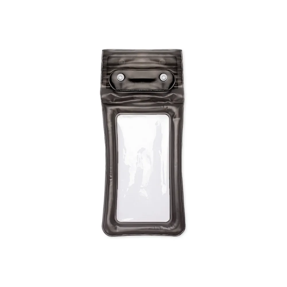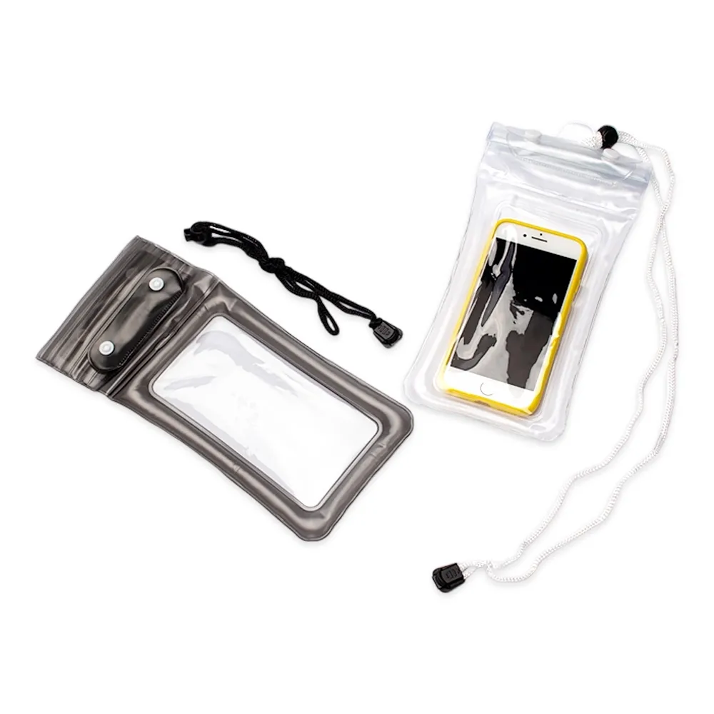 Capa impermeável com classificação IPX8 para smartphones, feita em PVC resistente, com área sensível ao toque que permite o uso pleno do aparelho. Possui vedação hermética e fechamento por botões de plástico. Acompanha cordão ajustável em nylon.