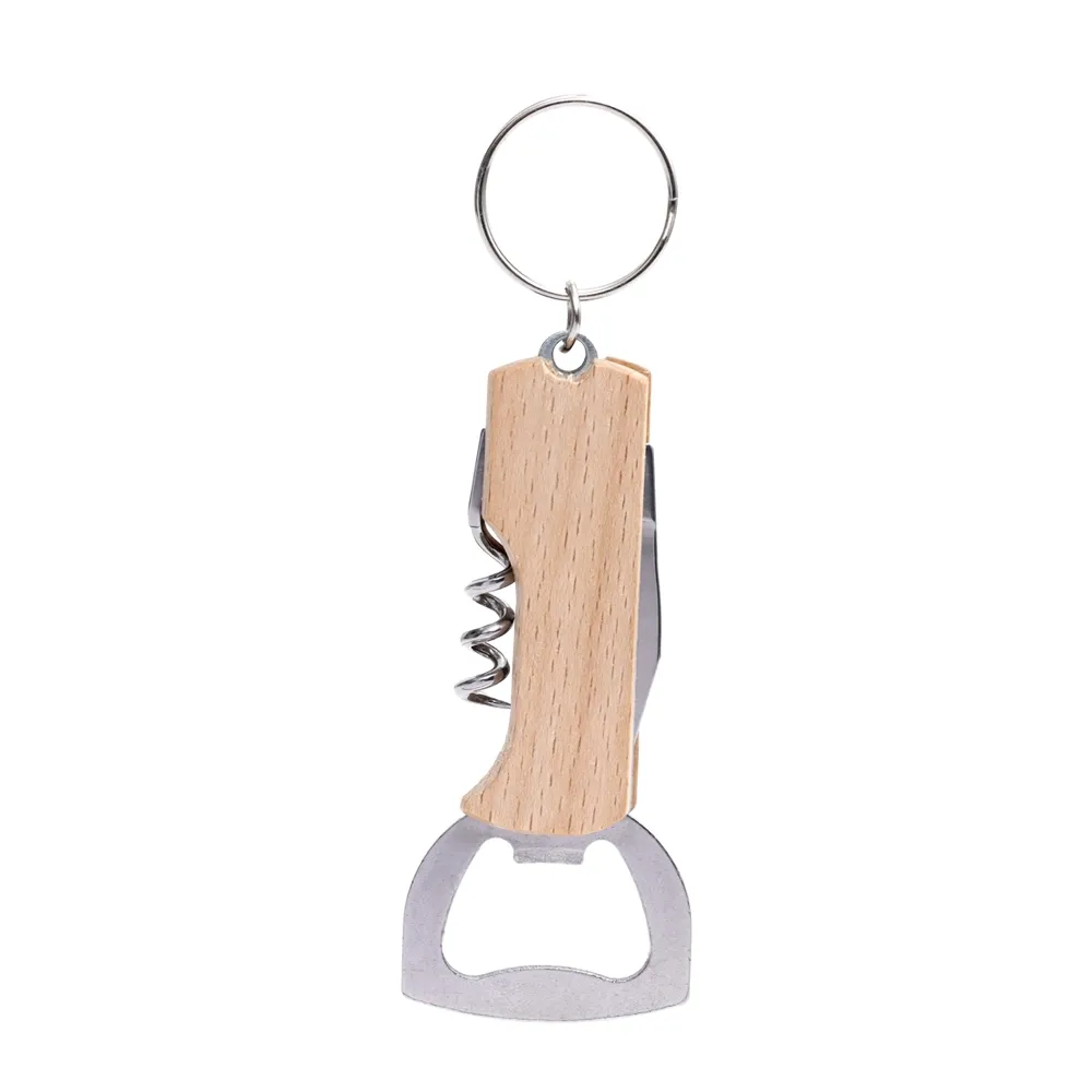 Chaveiro multifunções com estrutura em madeira e aço inox, possui três utilidades em um só acessório: um abridor de garrafas, um saca-rolhas e um canivete.