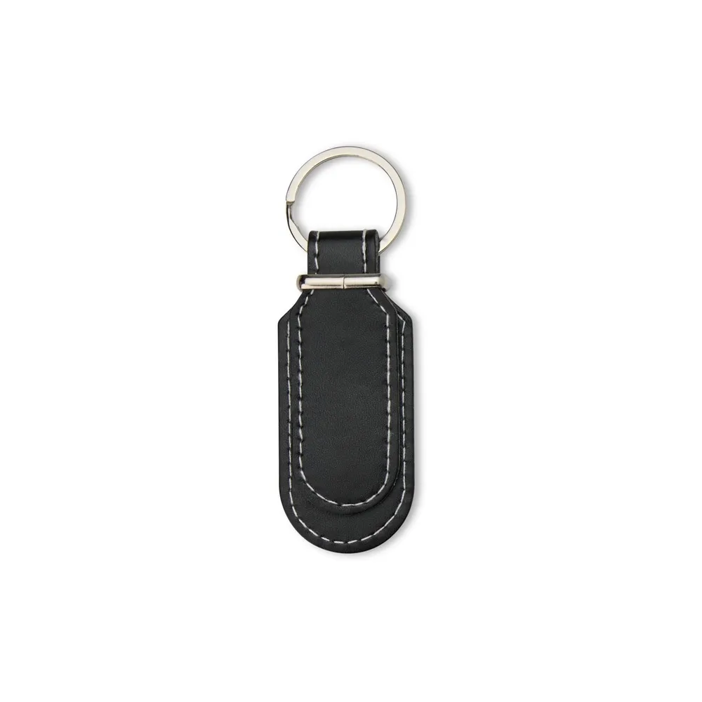 Chaveiro em formato minimalista em couro sintético com frente e verso lisos e argola de ferro niquelado.