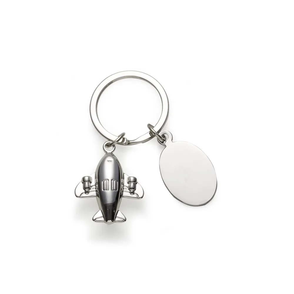 Chaveiro de metal avião 3D com placa para gravação.
