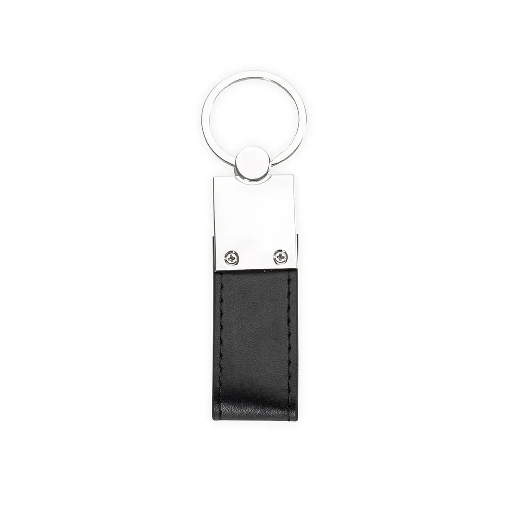 Chaveiro em metal brilhante com alça de couro sintético, frente e verso lisos e argola de ferro niquelado.