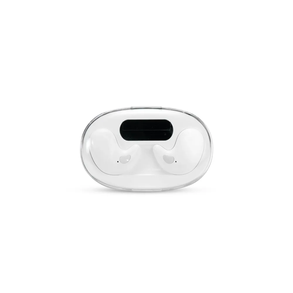 Fones de ouvido intra-auriculares sem fio, com estrutura leve e compacta em plástico e conexão via Bluetooth 5.3, garantindo estabilidade durante o uso. Possui estojo de carregamento com display de LED para visualizar o nível de carga. Acompanha cabo USB-C.