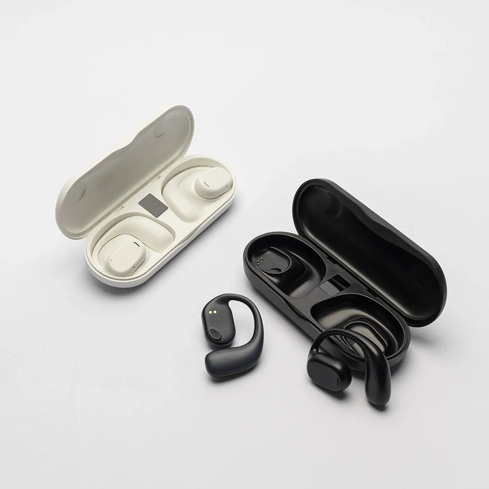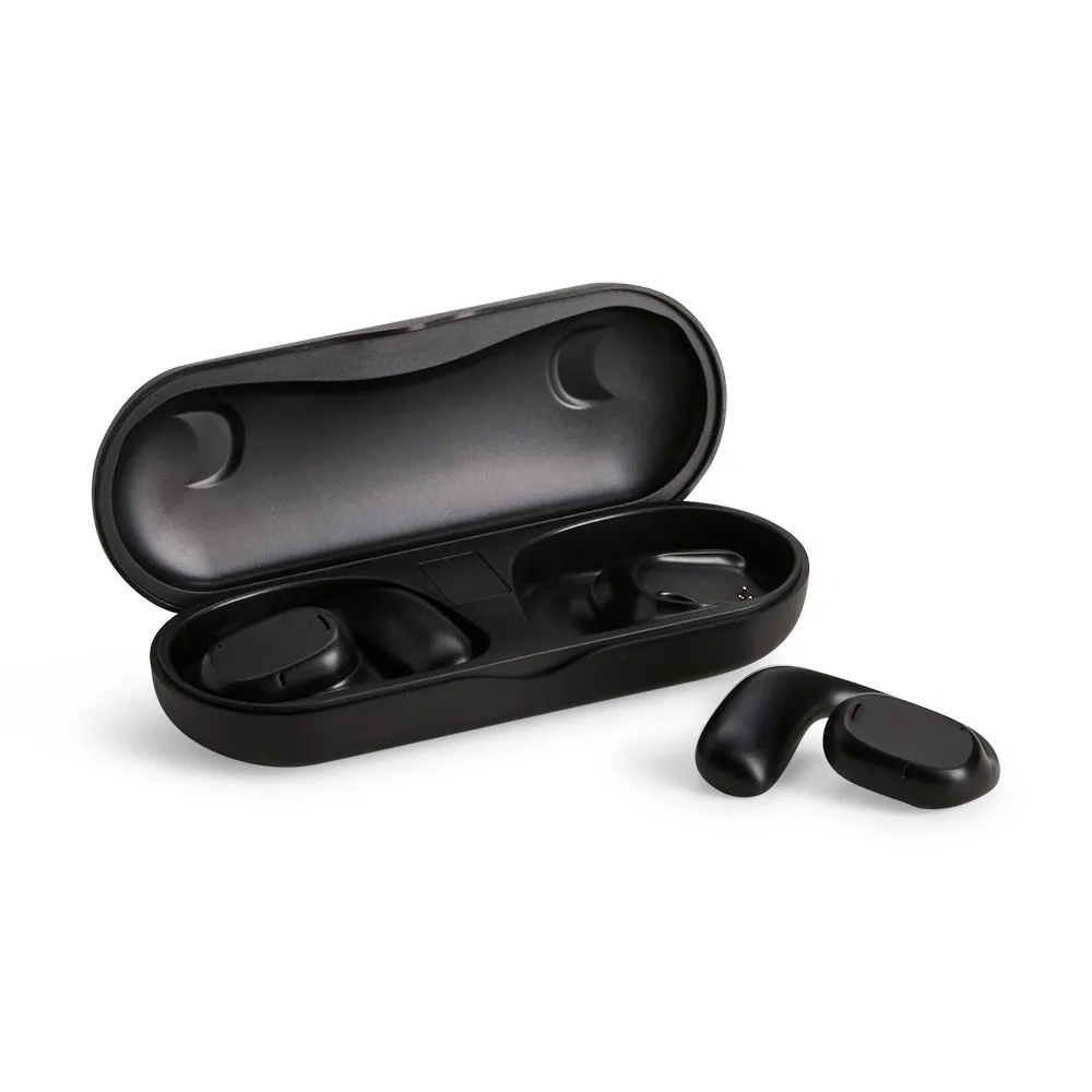 Fones de ouvido sem fio com estrutura em plástico. Possuem formato aberto e ergonômico, permitindo o encaixe nas orelhas sem entrar em contato direto com o canal auditivo. Possuem microfone interno para chamadas pelo celular ou WhatsApp. Apresentam conexão via Bluetooth 5.3 que oferece uma transmissão de dados mais estável e com maior qualidade. Acompanha estojo de carregamento com visor de percentual da carga total, além de cabo USB-C para recarga.