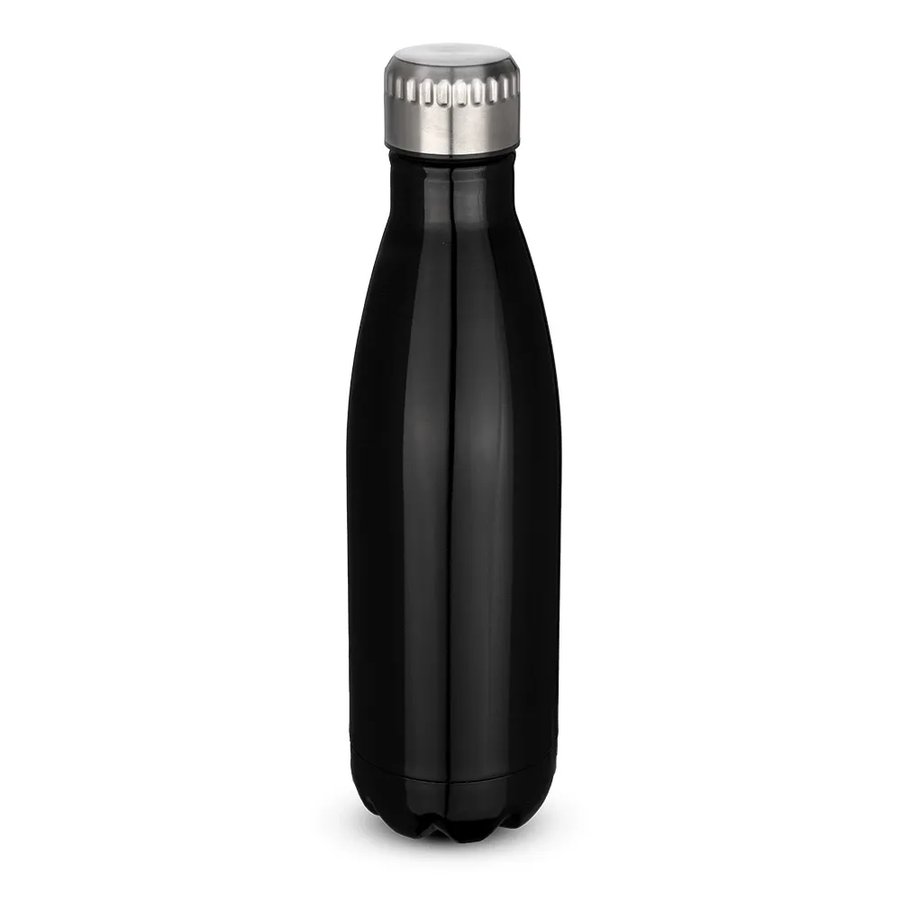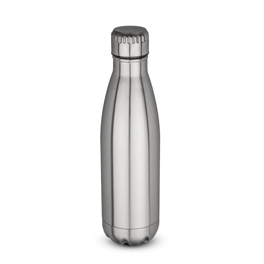 Garrafa em aço inox 304 com capacidade de até 700 ml. Tampa rosqueável e anel de silicone para vedação. Design com frisos na tampa.