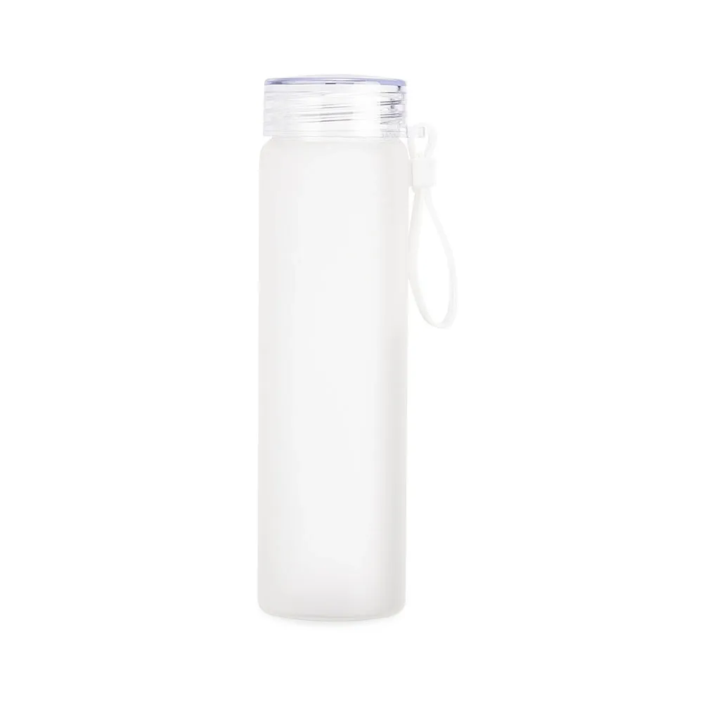 Garrafa de vidro jateado bicolor, capacidade de 470ml. Contém alça de silicone.
