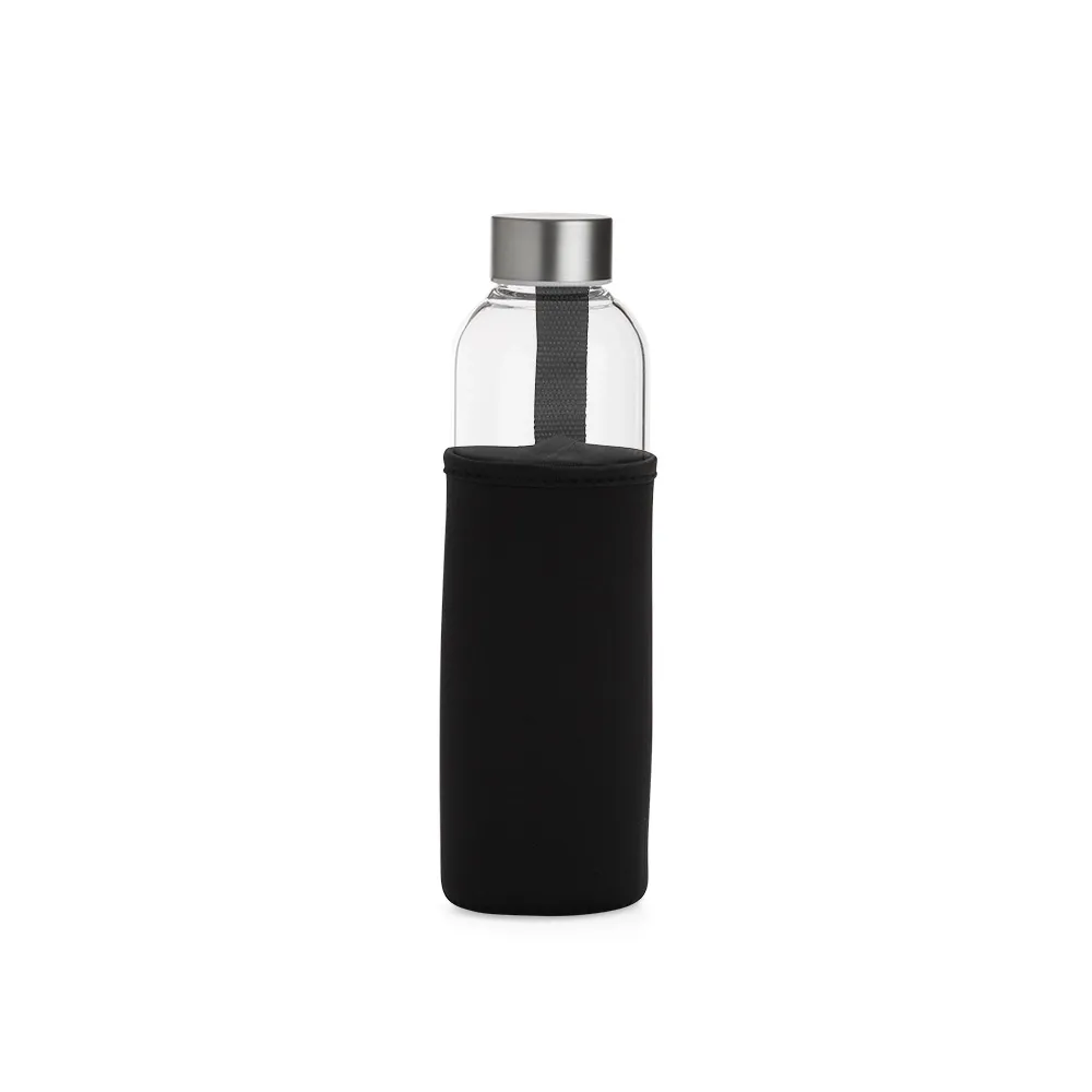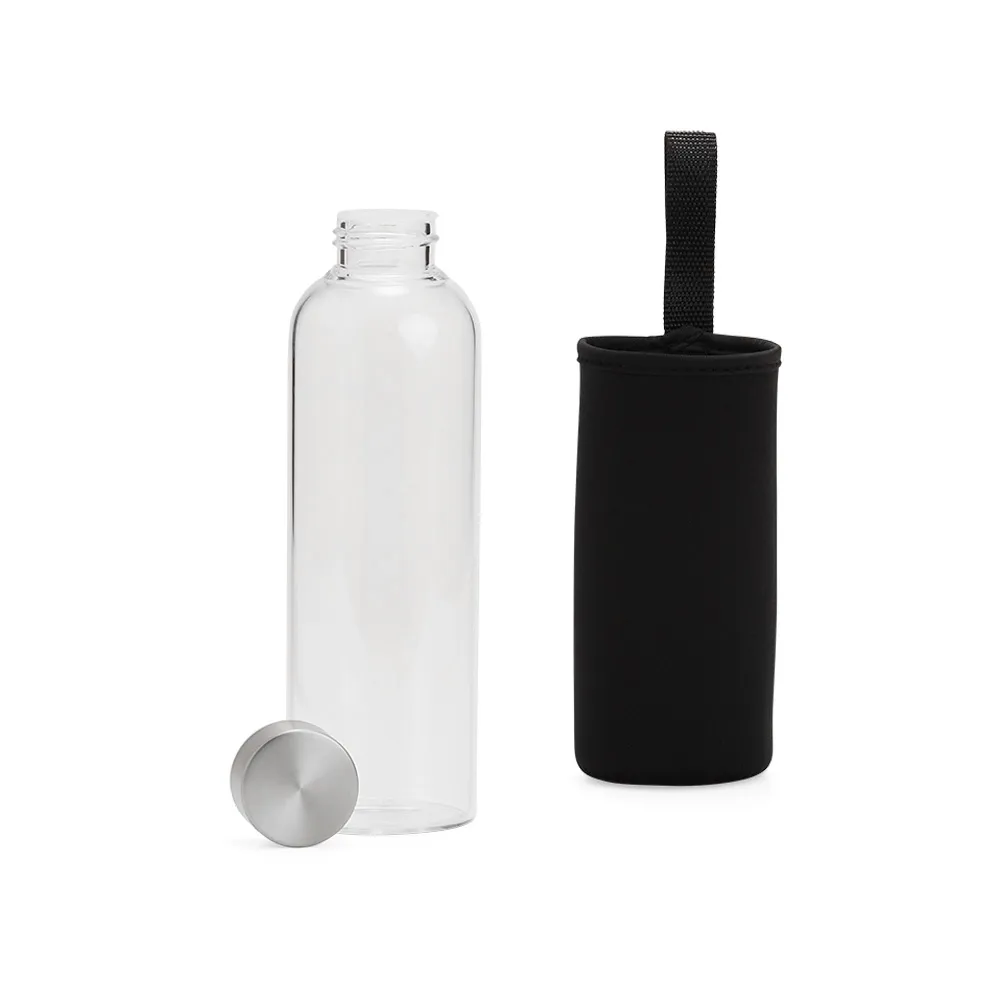 Garrafa de vidro borossilicato com capacidade de 650ml, acompanha capa de neoprene com alça para transporte. Tampa de alumínio.