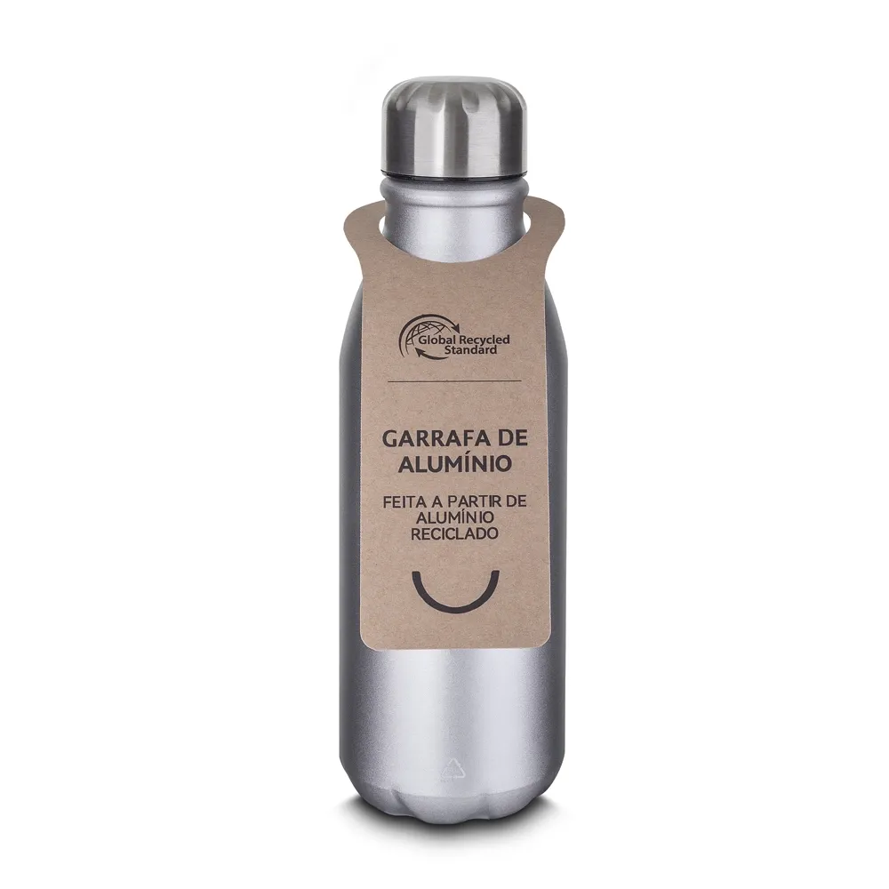 Garrafa em alumínio reciclado com capacidade de 550ml. Tampa rosqueável em inox. Pintura fosca.\r\n\r\n*Todas as garrafas acompanham etiqueta em papel kraft com descrição do produto.\r\n\r\n*Apresenta símbolo de reciclável na parte traseira do produto.