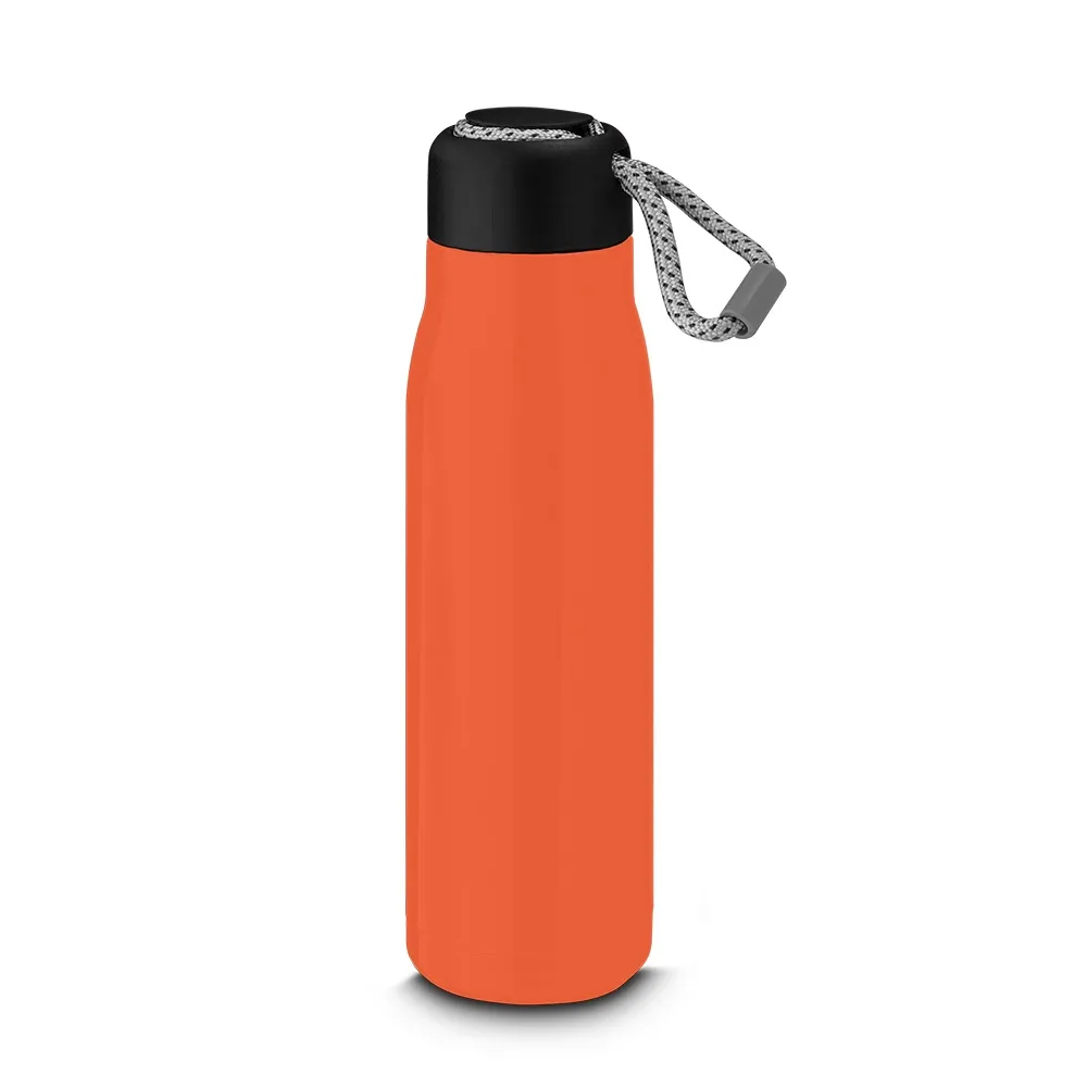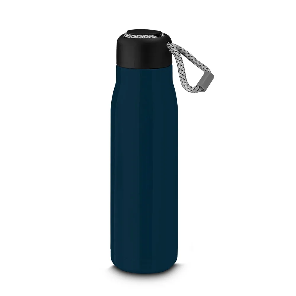 Garrafa térmica em aço inox brilhoso com parede dupla isolada a vácuo, com capacidade de até 550ml. Alça de transporte em corda. Tampa plástica rosqueável com anel de silicone para vedação.\r\n\r\nConserva líquidos : ☀️8 horas ❄️12 horas\r\n\r\n