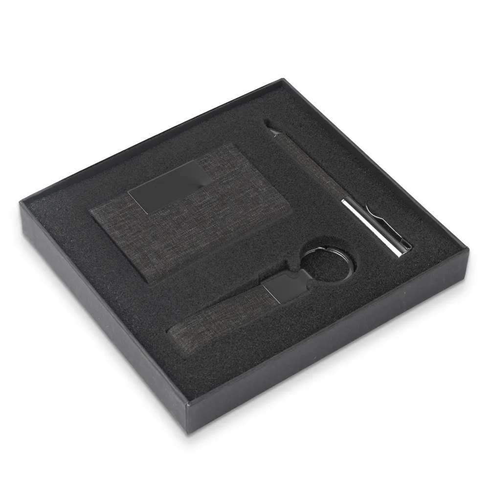 Kit Escritório, contendo:\r\n\r\n1 Chaveiro em metal com detalhe em RPET reciclável;\r\n1 Caneta Metálica com detalhe em RPET reciclável;\r\n1 Porta Cartão em detalhe em RPET reciclável.\r\n\r\nAcompanha berço com espuma.