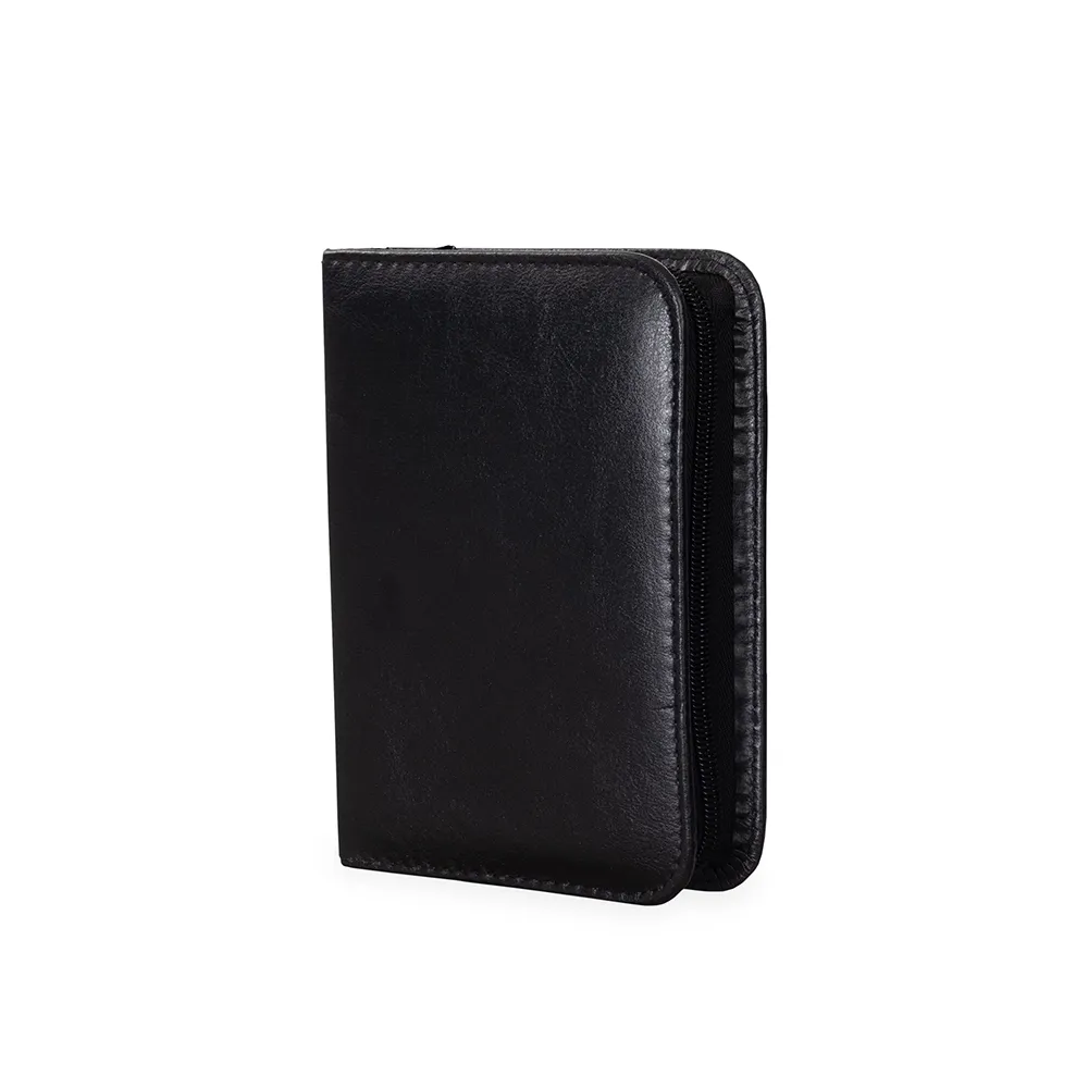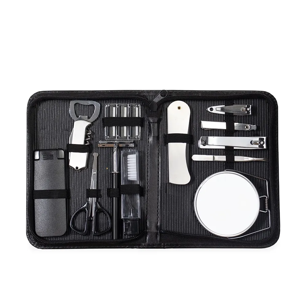 Kit masculino 12 peças em estojo de couro sintético, parte interna revestida com plástico em relevo e elástico para fixação dos itens. Possui: removedor de pelos, abridor saca rolha, tesoura, aparelho de barbear, lâminas para barba(3 unidades), escova de dente, pente, cortador de cutícula, mini kit unha 3 em 1(empurrador de cutícula, lixa, limpador de unha), cortador de unha, pinça e espelho duplo com aumento.
