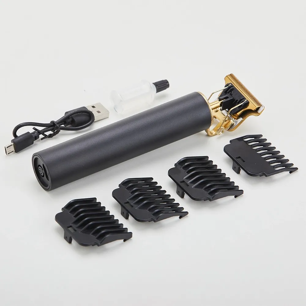Máquina de cortar cabelo recarregável com lâminas em aço inoxidável e corpo plástico. Acompanha 4 pentes plásticos (1.5mm, 2mm, 3mm e 4mm), escova de limpeza, óleo lubrificante e cabo USB-V8.