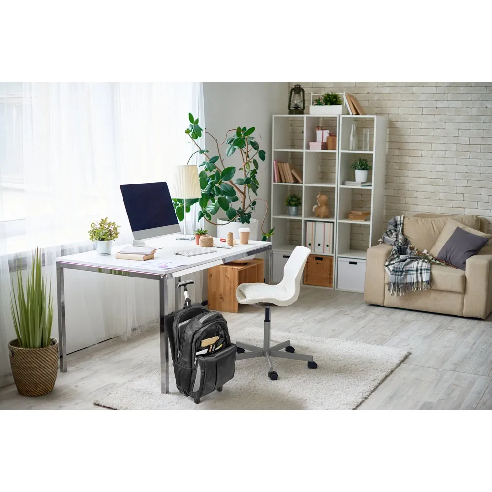 Mochila trolley para notebook em Nylon 999 impermeável com 2 rodas com sistema de proteção integrado. Possui um compartimento principal almofadado para notebook até 17’’, um compartimento forrado e diversos bolsos. Bolso frontal com zíper e bolsos laterais em tela mesh. Trolley com pega extensível em alumínio com mola (altura da pega estendida até 550 mm), sendo a estrutura removível. Placa metálica removível com imã para fácil gravação. Capacidade até 30 L e peso de 1.70 kg. 350 x 460 x 225 mm | Placa: 50 x 20 mm