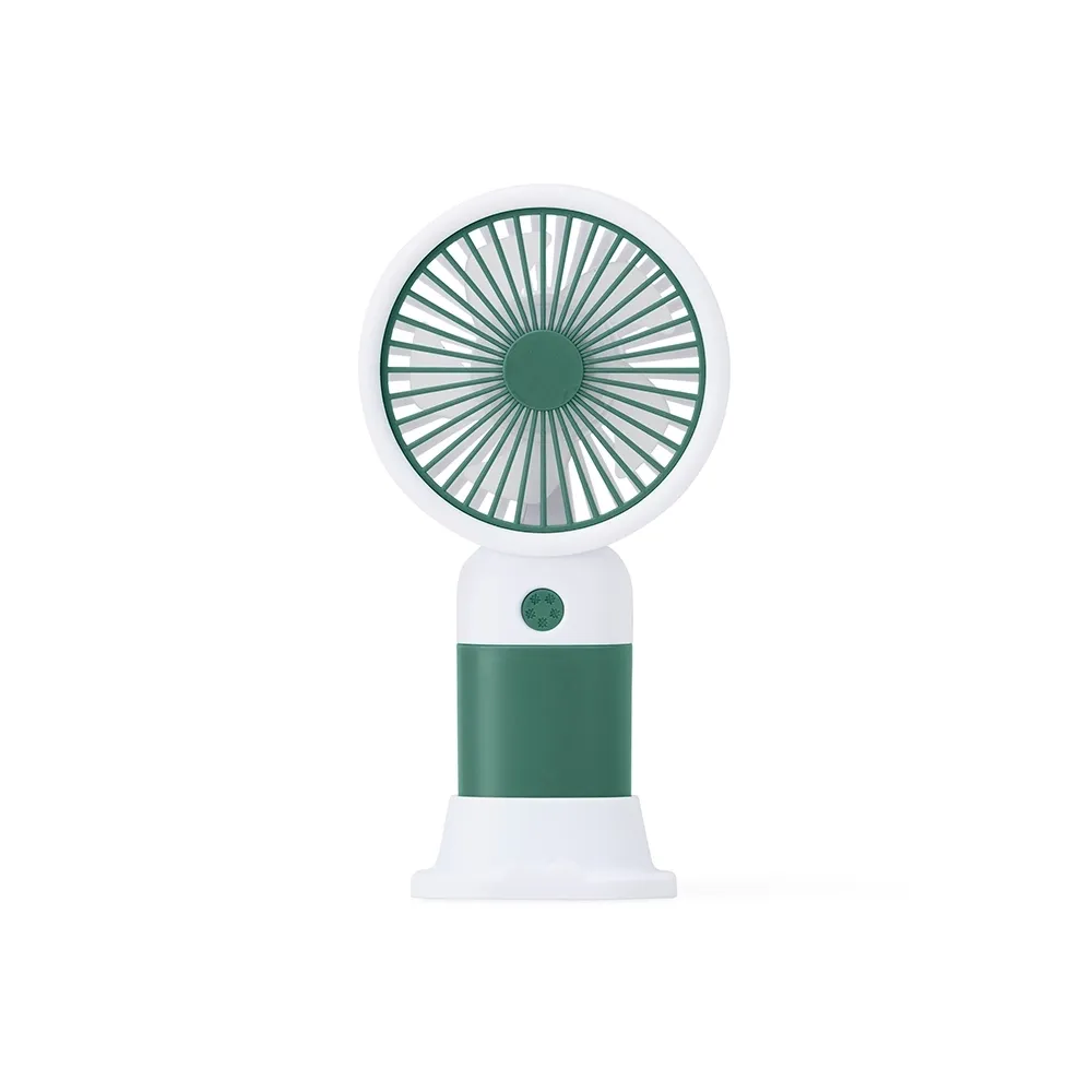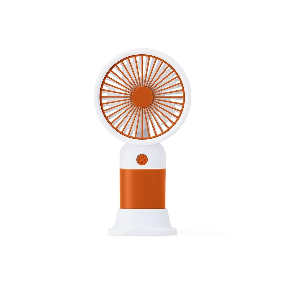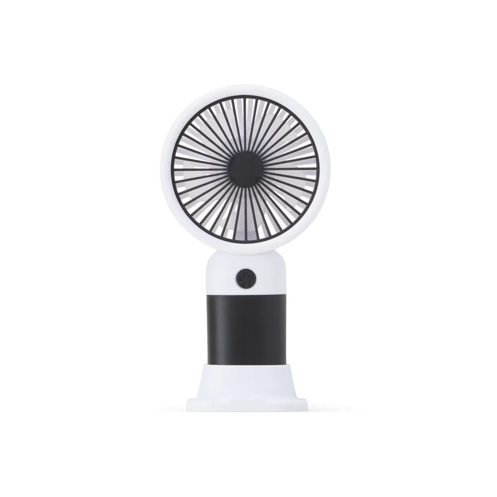 Mini ventilador plástico recarregável com base removível e botão de acionamento. Acompanha cabo usb.