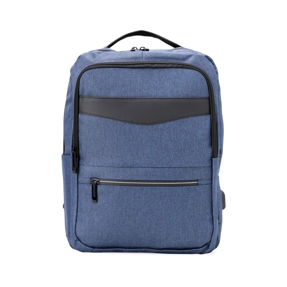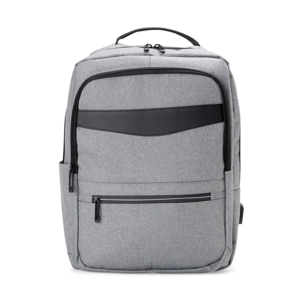 Mochila de nylon 22 Litros com detalhes em couro sintético e três compartimentos, sendo o principal com bolso para notebook 15,6. Mochila possui bolso lateral e suporte externo usb.