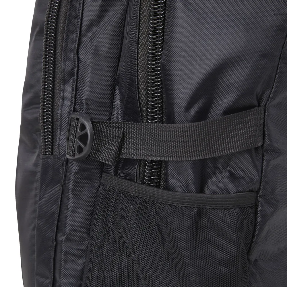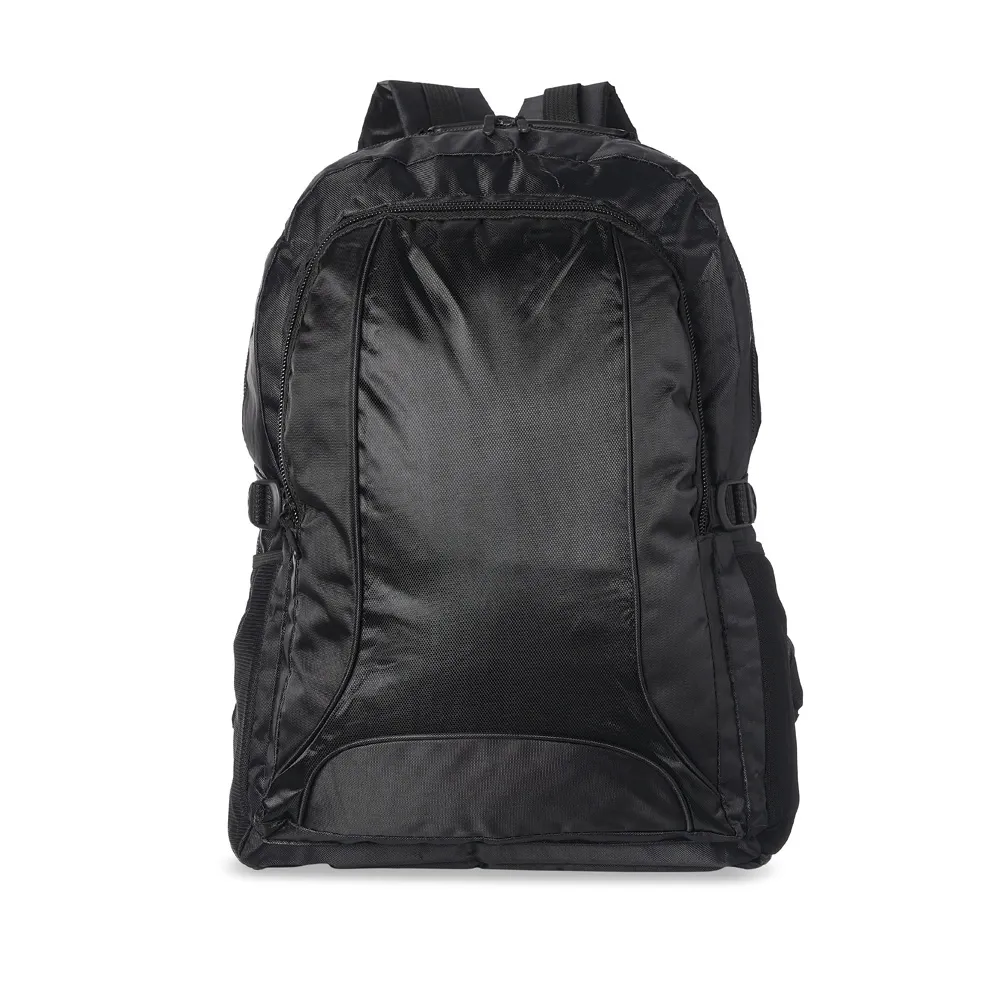 Mochila de nylon 35 litros com dois compartimentos e bolsos laterais em malha. Possui fivelas laterais para regulagem de tamanho e duas alças de mãos, sendo uma delas reforçada com pegador plástico.