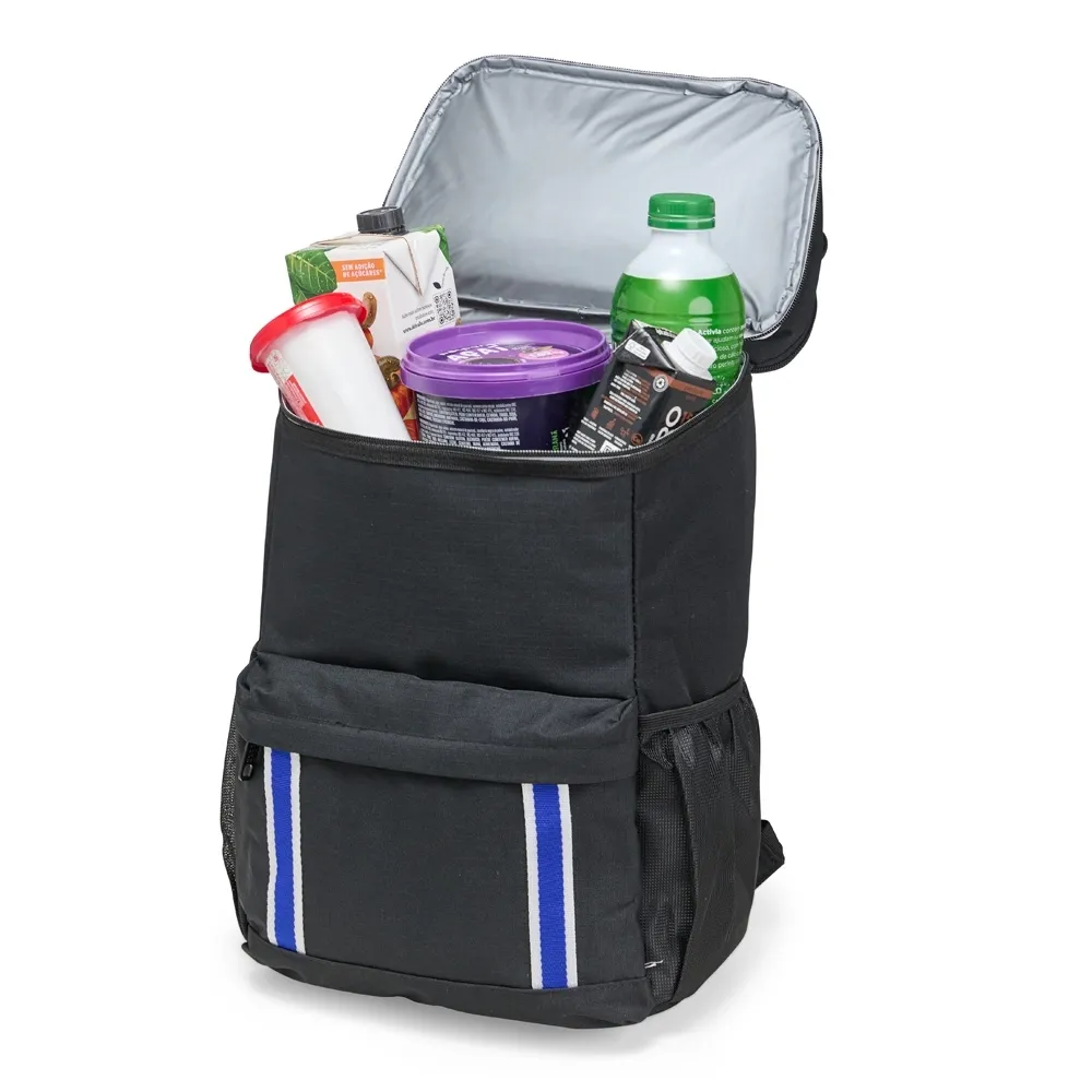Bolsa térmica confeccionada em poliéster impermeável com fechamento em zíper e capacidade para até 24 litros. Conta com revestimento térmico antivazamento em PEVA e dois compartimentos externos, incluindo um localizado na parte superior também com revestimento térmico e capacidade para até 1,5 litro. Possui ainda uma alça de mão em nylon e um par de alças para as costas com revestimento em tecido respirável.