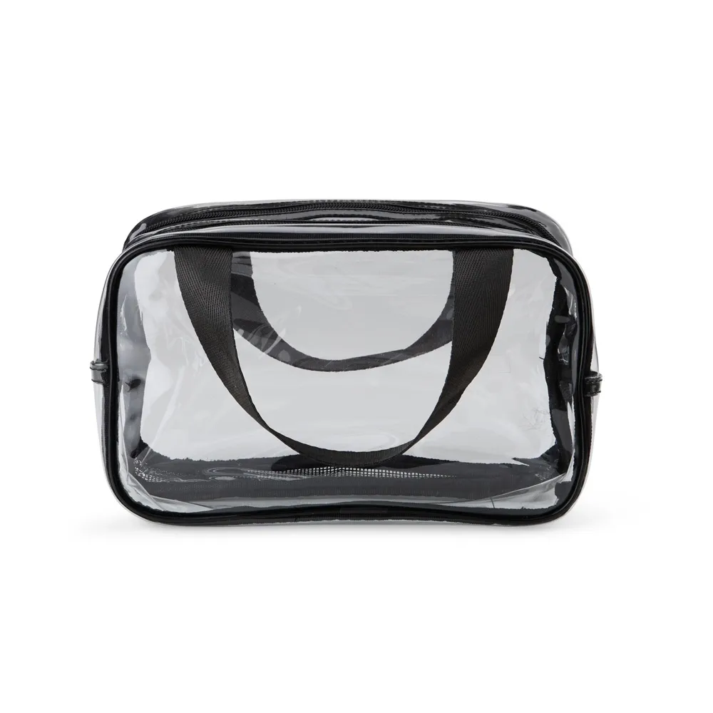 Nécessaire de PVC. Possui dois compartimentos e duas alças laterais de mão em nylon.